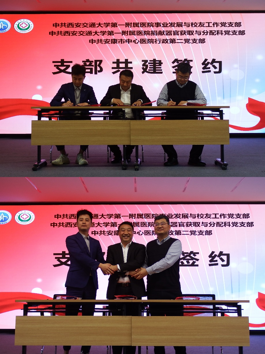 会议第一项,由西安交通大学第一附属医院捐献器官获取与分配科党支部书记丁晨光、事业发展与校友工作部党支部雷磊、安康市中心医院行政第二党支部书记晏显兴共同签订党支部结对共建协议,希望通过联学联建,强化党建引领作用,共同推进器官捐献事业发展。