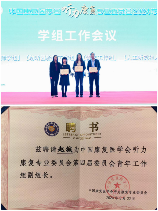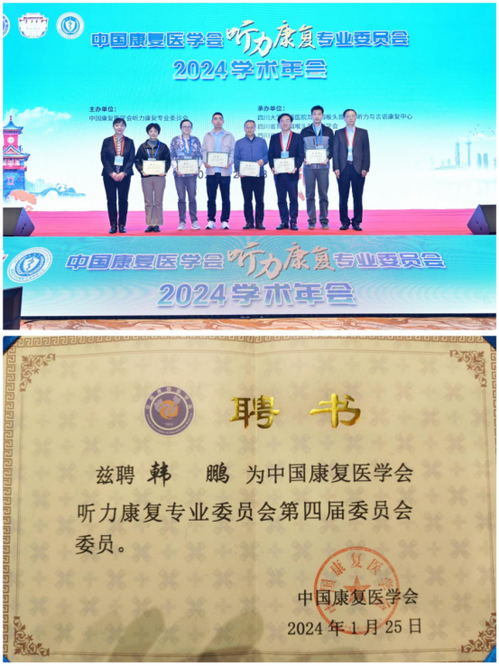 我院耳鼻咽喉头颈外科副研究员韩鹏博士增补为中国康复医学会听力康复专业委员会第四届委员会委员,耳鼻咽喉头颈外科临床听力学中心赵铖听力师聘为中国康复医学会听力康复专业委员会第四届委员会青年工作组副组长。