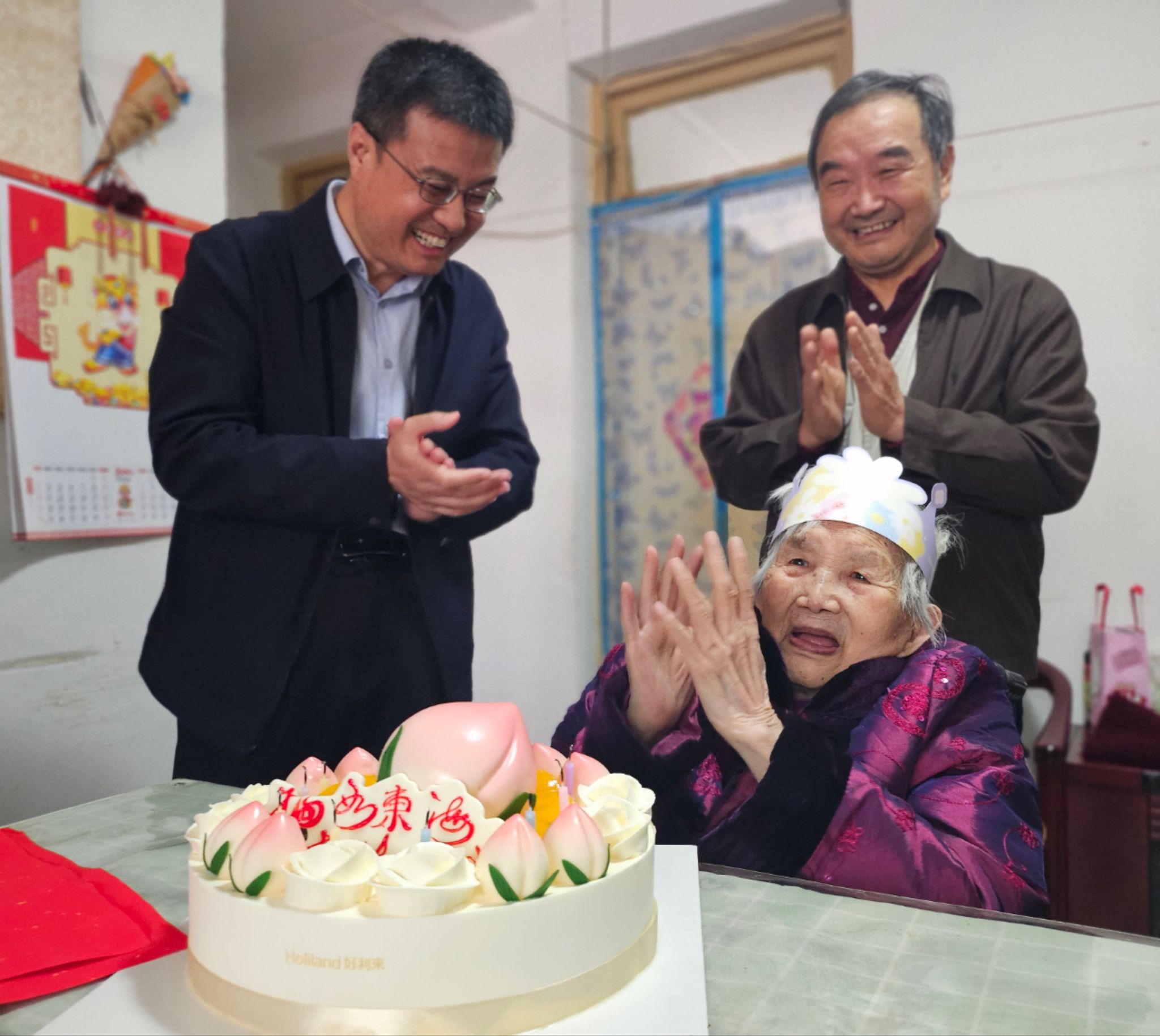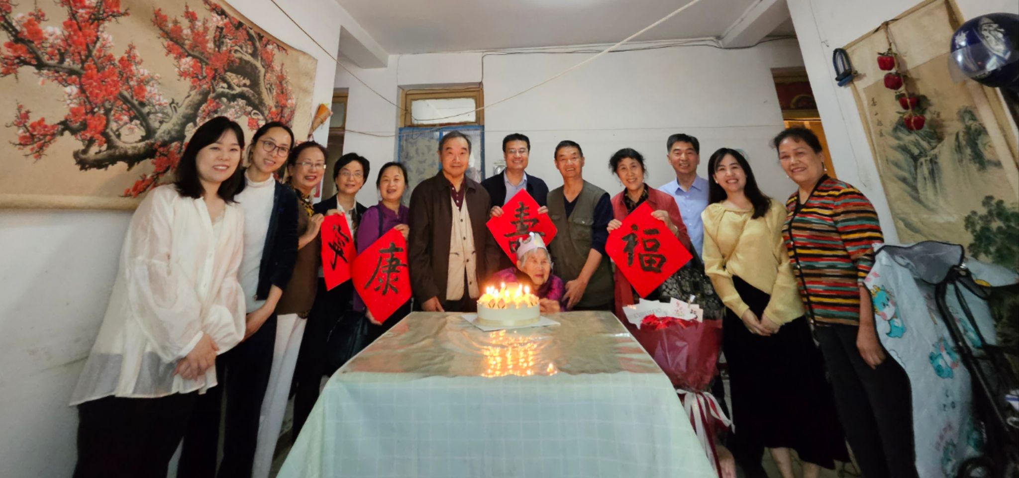 尚德信老师生于1924年4月26日,于1952年5月工作,是医院儿科的创始人之一,在医院工作近40年,是医院现在年龄最长的离退休职工,也是医院建院以来的第一位百岁老人。医院领导非常重视,专门组织相关科室为老人百岁贺寿,为尚德信教授送上手写的祝福语和生日蛋糕、贺卡、鲜花等。在老人家中,党委副书记冯广林紧紧握着尚老师的手说:“我受吕毅副校长、马辛格书记委托,代表所有院领导班子成员前来家中为您祝寿。您为医院的发展呕心沥血,您的健康长寿是我们的心愿,我代表医院党政班子感谢您为医院发展所做的贡献,祝愿尚老师福如东海,寿比南山。”儿科主任周熙惠说:“尚老师在工作中认真负责、严谨钻研,待人宽厚,爱院奉献的精神感染和带动我们年轻一代,儿科的发展离不开您的淳淳教导,我们会经常带着年轻医护人员来看望您,把您的精神一代代传承下去。”在场所有人一起为尚老师齐唱生日祝福歌,争相与老寿星握手、拥抱,感受这份长寿健康的“福”气。尚老师手捧鲜花,被温暖的气氛围绕,脸上始终洋溢着幸福的笑容。离退休办公室副主任韦剑平告诉老人及家属:“离退休办公室就是为大家做服务的,家里有什么需要帮助,随时联系。”尚老师的家人向冯书记一行表达了感激之情,感谢医院长期的关怀,让他们感受到医院大家庭的温暖。