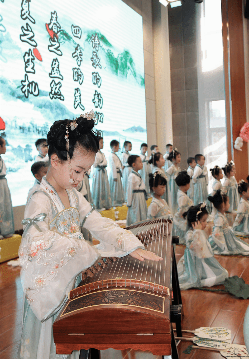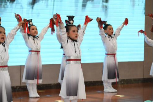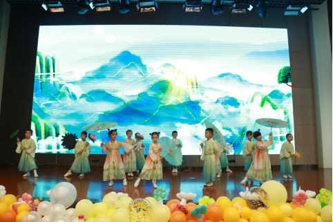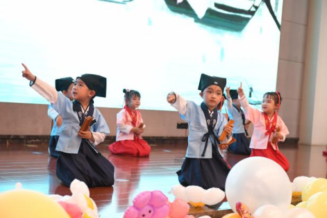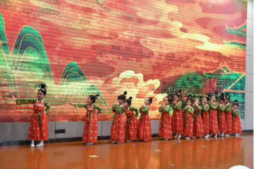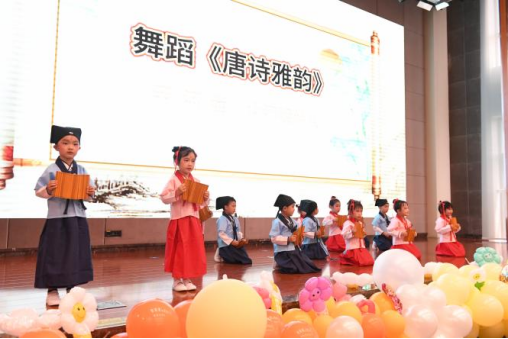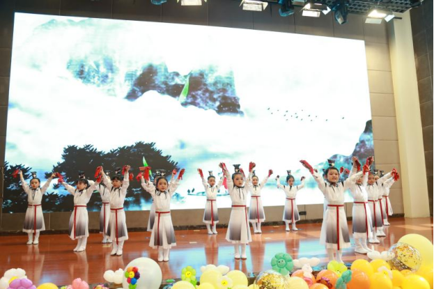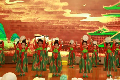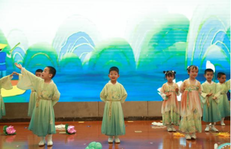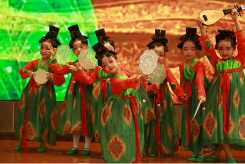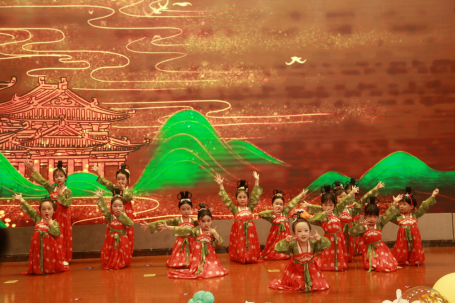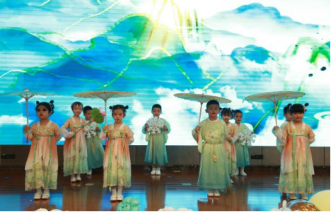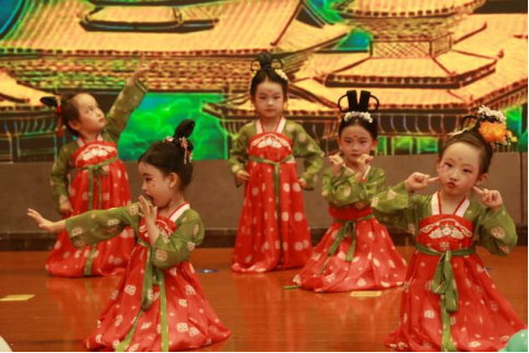 舞台上,数十个幼儿表演节目创意均来自传统文化。孩子们用《博物馆奇妙夜》和《小唐俑》舞蹈跨越千年,演绎出一群活泼灵动的唐朝少女,她们仿佛从古画中走来,时而嬉笑打闹,时而梳妆打扮。
