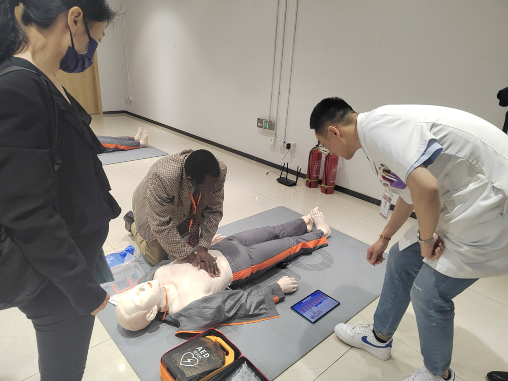 在参观过程中,我院代表团深入了解阜外医院自1956年建院以来的重要历史里程碑和医疗成就,以及援非工作经验和成果,展示了医院在国际合作方面的深远影响。其配置齐全先进的医疗培训模拟中心,能够为各国来华学习人员提供高度仿真的培训环境,我院参访人员和非洲学员现场进行了实践操作体验。