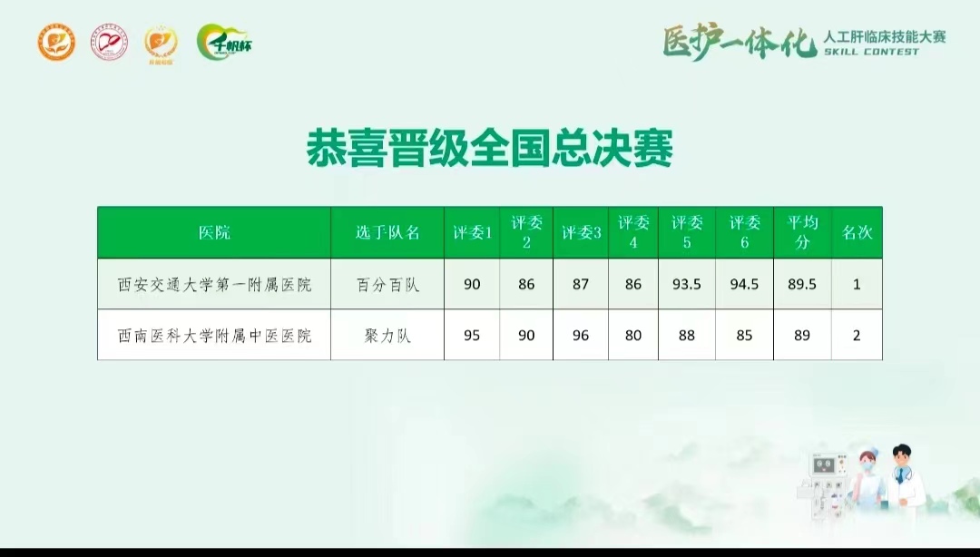 参加比赛队伍分别来自宁夏、重庆、甘肃、四川、陕西、贵州。在这场智慧火花与技术精粹的激烈交锋里,经过3小时的角逐,西安交通大学第一附属医院感染科人工肝团队的医生赵亚磊和护士侯静涛以总分第1名的成绩进入了医护一体化-人工肝临床技能大赛全国总决赛。