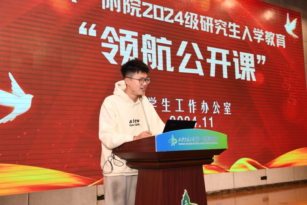 本次“领航公开课”首先由我院党委副书记冯广林致辞。冯书记强调,作为一名医护人员,我们所从事的职业与人民的生命息息相关,是神圣且责任重大的。他指出,通过此次“领航公开课”,从院史介绍到学长经验分享等环节,希望同学们能够明确自身肩负的责任、树立远大的理想,以“今天我以一附院为荣,明天一附院以我为傲”的精神面貌迎接未来研究生生活中的各种挑战。