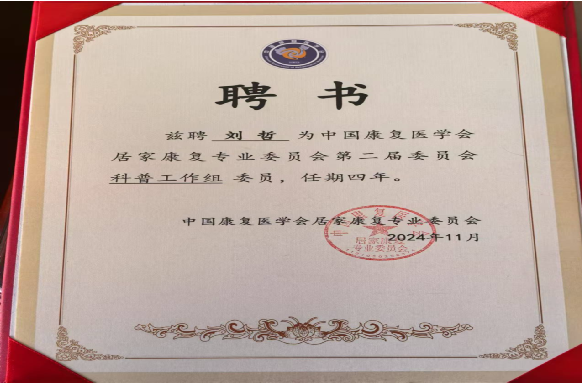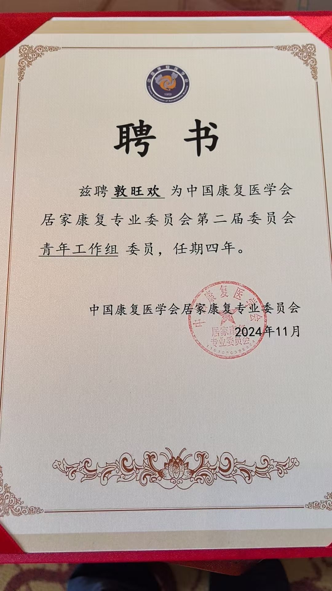 2024年11月30日第二届中国康复医学会居家康复专委会换届工作在青岛举行。我院康复医学科尚翠侠教授连任副主任委员。并受邀在2024中国康复医学会居家康复专业委员会学术年会上做学术交流。同时康复医学科敦旺欢医师被聘为中国康复医学会居家康复专业委员会第二届委员会青年工作组委员,刘哲医师被聘为中国康复医学会居家康复专业委员会第二届委员会科普工作组委员。