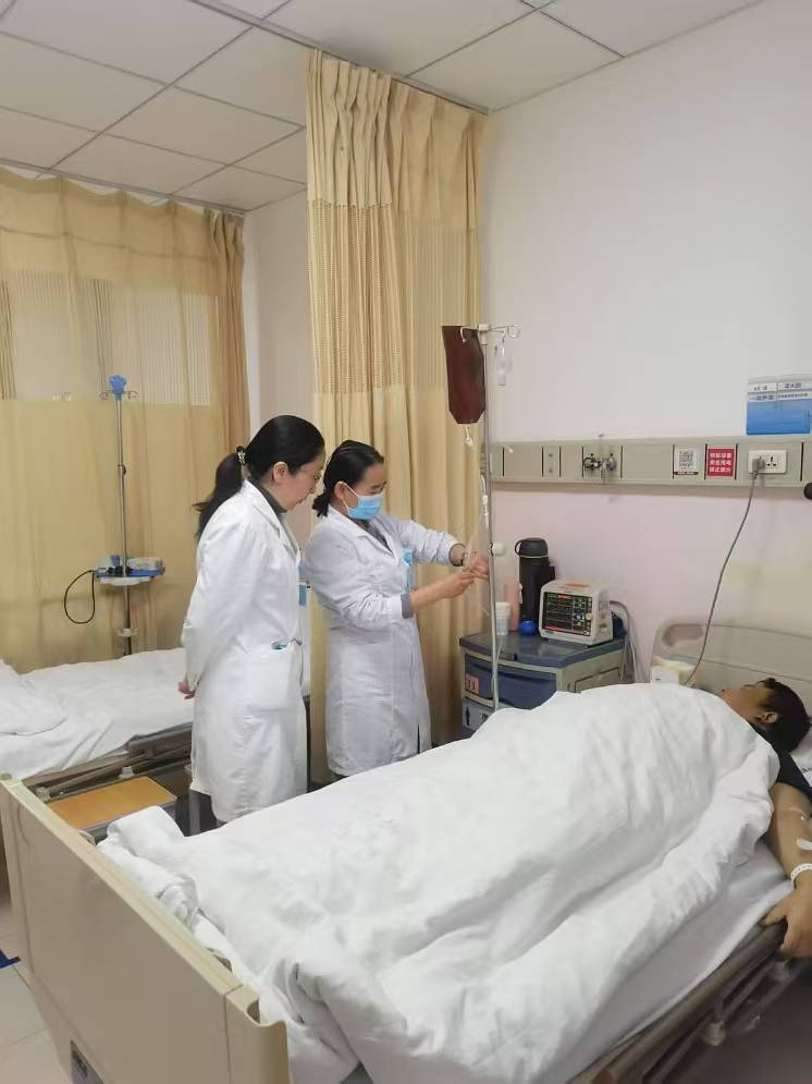 通过前期一系列的筹备与准备,“异体骨髓间充质干细胞注射液治疗慢加急性肝衰竭”的临床研究项目在感染科药理基地正式启动。经过充分知情和严格筛选,一例30多岁的慢加急性肝衰竭患者,符合所有的入选标准,不符合任何一项排除标准,成功进入基线。在何英利主任带领下,在杨瑗副主任,李建洲医生的现场指导下,2024年11月24日下午15;43分,此项目首例筛选成功受试者开始首次用药。在用药的过程中,研究护士朱娅鸽老师忙于给病人讲解治疗的目的,注意事项,监测病人的生命体征及自觉症状。为了预防细胞沉淀,需要每5分钟上下摇晃输液袋。16:40分,病人首次用药顺利结束,大家悬着的心才趋于平静,患者及家属也露出来满意的笑容。