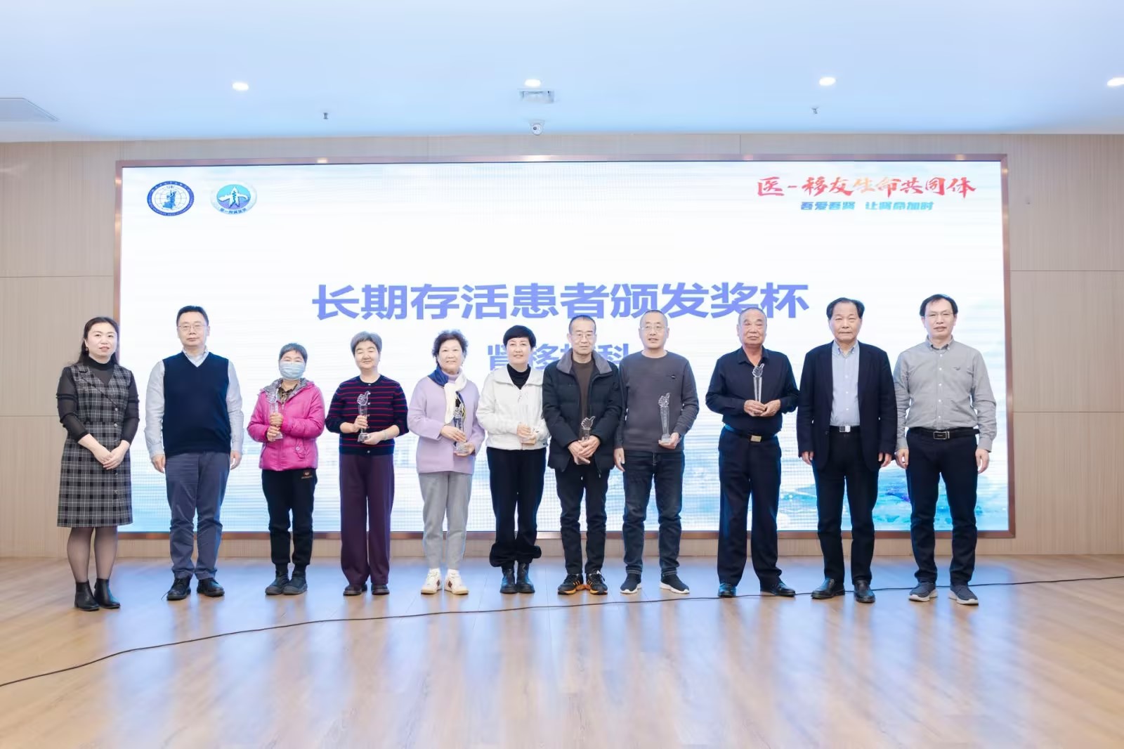 活动第四项:为肾移术后长期存活患者颁发奖杯。长期存活患者无疑是我们伟大医学的见证者,现场由肾移植主任、肾脏病院副院长、肾移植科副主任为:肾移术后存活10年以上,20年以上的7位患者颁发长期存活奖杯,紧接着7位患者就自己长期存活的秘诀进行了一一分享。患者朋友们提到:最重要的就是要心态好、遵医嘱、定期复查、注意饮食、适量运动,同时一定要有要坚定的生存信念与目标,其中两位患者的以孩子为存活信念:我想看他高中毕业、我想看他大学毕业。我与未来的3年之约,再3年之约到5年之约深深触动在场所有人。期待未来会有更多,更久存活的患者与我们一起创造更多生命的奇迹,活成移植界的标杆!