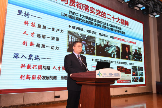 按照会议安排,马辛格书记以《有梦不觉天涯远,扬帆远航再出发》为题,代表医院班子对2022年工作进行了全面的总结回顾。马书记指出,2022年,我院始终坚持党的领导,引领医院高质量发展。全院上下深入学习贯彻落实党的二十大和学校第十三次党代会精神,将中央精神和学校要求融入医院发展战略;坚持团结一心、科学抗疫,承担守护人民生命健康的责任使命。面对两次疫情“大考”,派出30批医疗队共1089人,307批核酸采样医疗队共14276人,支援全国各地抗击疫情。在“新十条”政策发布后,全院上下一盘棋,全力以赴保急诊、保重症,应收尽收、能收尽收,有力扛起“国家队”的责任担当;过去一年,医院持续攀登医学高峰,稳步推进国家医学中心建设。确立13个攻关项目、7个平台支撑、5力融合保障,建立国内领先、世界一流、辐射一带一路的医工交叉特色的国家医学中心;以高质量发展与国考为导向,不断提升医院精细化管理能力和水平,持续推进“一院多区”建设;坚定落实党委领导下的院长负责制,以高质量党建引领医院高质量发展,践行历史使命,勇担援疆、援藏、援非等各项任务。2022年,在全院的共同努力下,医院在科技创新、人才培养、医工交叉、党的建设等多方面取得显著成果,医院入选“第三批全国党建工作标杆院系”。马书记说到,未来将继续围绕医院中心工作,牢牢把握国家医学中心建设的历史发展机遇,勇于担当作为,以更加昂扬的奋斗姿态开启高质量发展新征程。