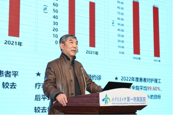 吕毅院长代表医院领导班子以《踔厉奋发担使命赓续前行向未来》为题,回顾我院在党建引领、干部队伍建设上取得的新进展,在国家医学中心和区域医疗中心建设、学科建设上取得的新成就,在医、教、研、产等方面取得的新突破,深刻分析医院当前工作存在的不足,展望医院未来发展的方向。他表示,2023年我院将紧紧围绕“中国特色世界一流名院”的宏伟目标,从国家医学中心和区域医疗中心建设、学科交叉医工结合、精细化管理、人才队伍建设、人文关怀等多方面全面提升医院综合指标,以时不我待的紧迫感、勇于担当的责任感、把握潮流的使命感,顽强拼搏、埋头苦干、勇毅前行,以国家医学中心建设为契机推进高质量发展再上新阶,为全面建设健康中国贡献新的更大力量!
