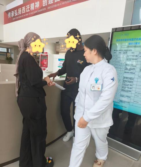 5月26日陕西科技大学留学生(哈萨克斯坦籍)因乳腺包块来院就医,具备英语基础的门诊导诊护士张梦晨不仅用英语交流反复沟通病情,辅以手势和微笑安抚,让患者在异国他乡感受到“家一般的温暖”,化解异国语言沟通障碍,协助完成挂号、缴费等操作,最终引导患者至胸外科就诊。在“一带一路”的建设引领下,交大一附院国际陆港医院以开放包容的态度迎接外籍患者,“医疗无国界,服务无止境”,我们不仅要治愈疾病,更要传递跨越文化的人文温度。在这场无声的文明对话中,中国医护正以专业与温情,书写着属于新时代的“国际医疗故事”。