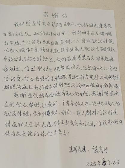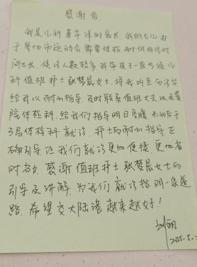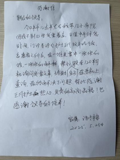 近日,交大一附院陆港院区门诊部的一个文件夹悄然“增厚”,短短几个月内,这里陆续收到10封患者亲笔书写的表扬信。这些信纸背后,有外籍患者来院就医因语言交流障碍求助得到帮助,有急危重症患者出现突发状况及时转诊就医,有外地患者慕名求医没有挂号焦急万分给与协调解决,有慢病老人发现退费报销难题时的暖心陪办,还有年轻妈妈带着孩子分诊人员给予正确引导省下的奔波……交大一附院门诊部用患者口碑丈量服务质量,从流程优化到体验感提升,正将患者的肯定转化为服务升级的持续动力。