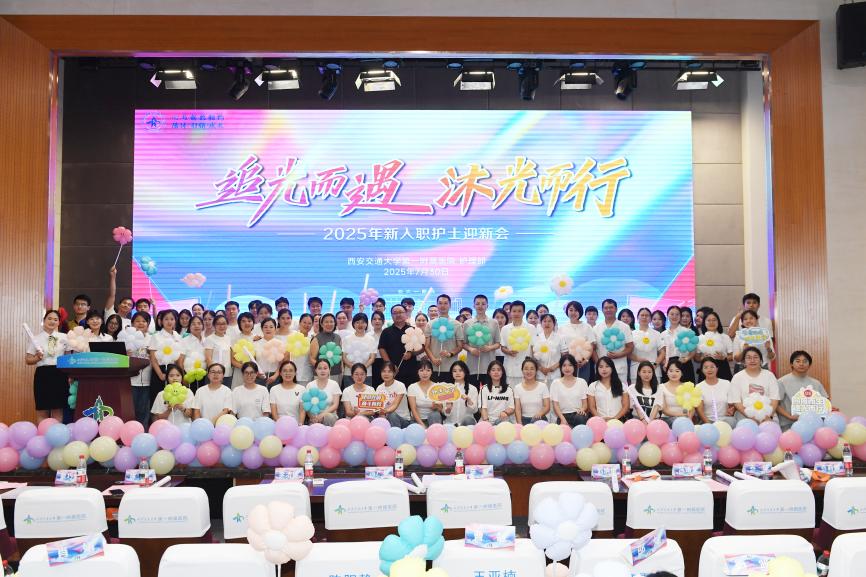 盛夏炽阳燃热血,医路星河启新程。承载着守护生命的赤忱与理想,2025年度125名护理新生力量正式融入西安交通大学第一附属医院的星河征途。为助力新护士锚定职业航向、淬炼使命担当,2025年7月30日下午14:30,护理部于新科教楼三层报告厅举办了“追光而遇 沐光同行”主题迎新会。