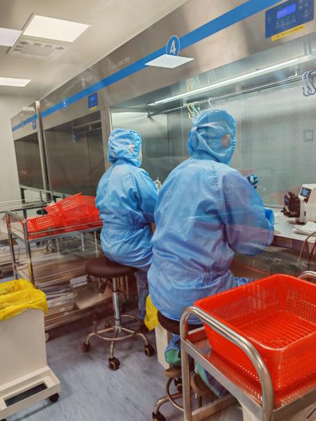环境管控环节:建立“定时清洁+实时动态监测”双轨机制,对万级洁净调配间、生物安全柜、操作台等重点区域,采用医用酒精消毒、层流净化等方式开展全方位控感;对药品转运箱、摆药筐等仓外各工作区域进行人工日常消毒,持续守护无菌调配环境。