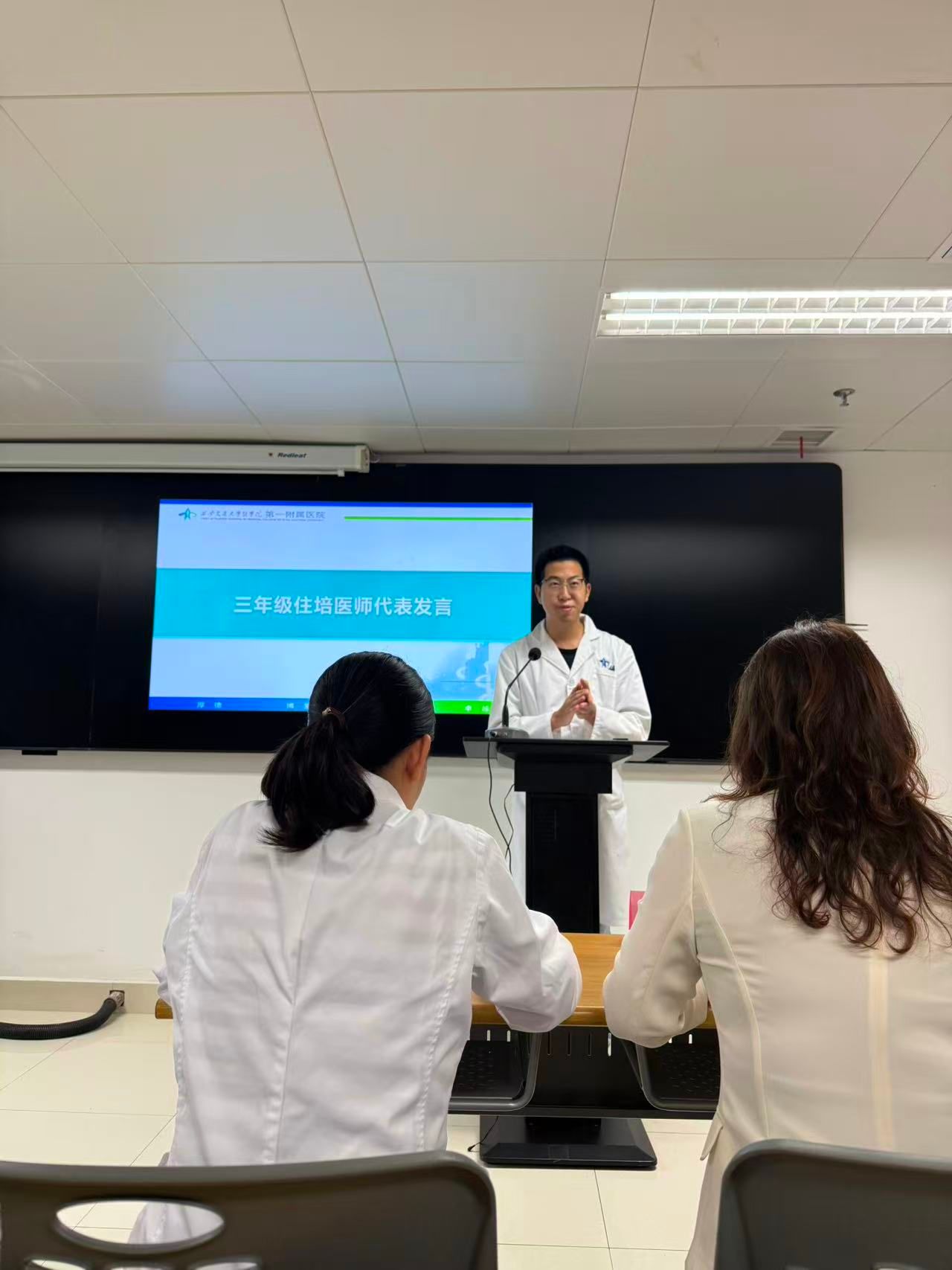 随后,基地主任张玮致辞。她对新加入的住培医师表示热烈欢迎,并着重叮嘱他们:需尽快适应医院临床工作节奏,主动完成从 “医学生” 到 “临床医师” 的身份转变。张玮主任特别指出,成为我院住培医师,不仅是学习身份的转变,更意味着正式成为医院职工的一员 —— 这要求住培医师既要勇于承担临床岗位职责,保持主动学习的积极性,也要注重与带教老师的沟通协作,在实践中持续提升临床能力,为未来服务患者打下坚实根基。