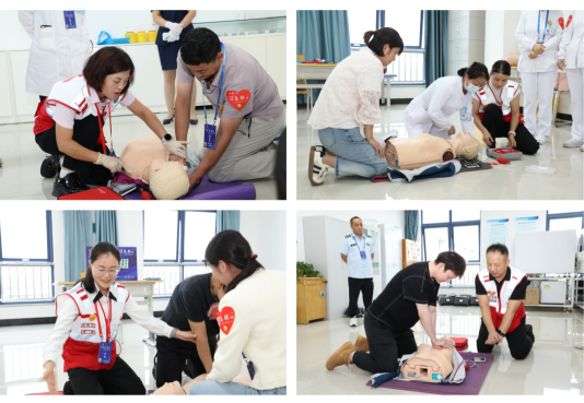 随后,进入实操技能培训环节,90名参培人员分成8组进行操作练习。大家使用模拟人进行CPR+AED实战演练。培训老师一对一指导按压深度、频率、正确进行人工呼吸等操作细节,确保每一位参培人员能掌握规范、有效的急救技能。一名社区工作者表示,“东院区组织的这次急救技能培训,收获满满。曾经觉得急救遥远又复杂,如今在专业老师的指导下,掌握了急救的关键技能。这不仅让我多了一项保障生命的能力,更让我深感责任在肩,未来一定会学以致用,积极传递急救力量。”