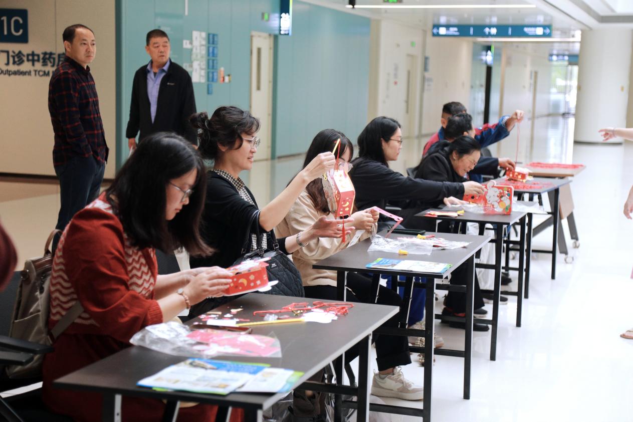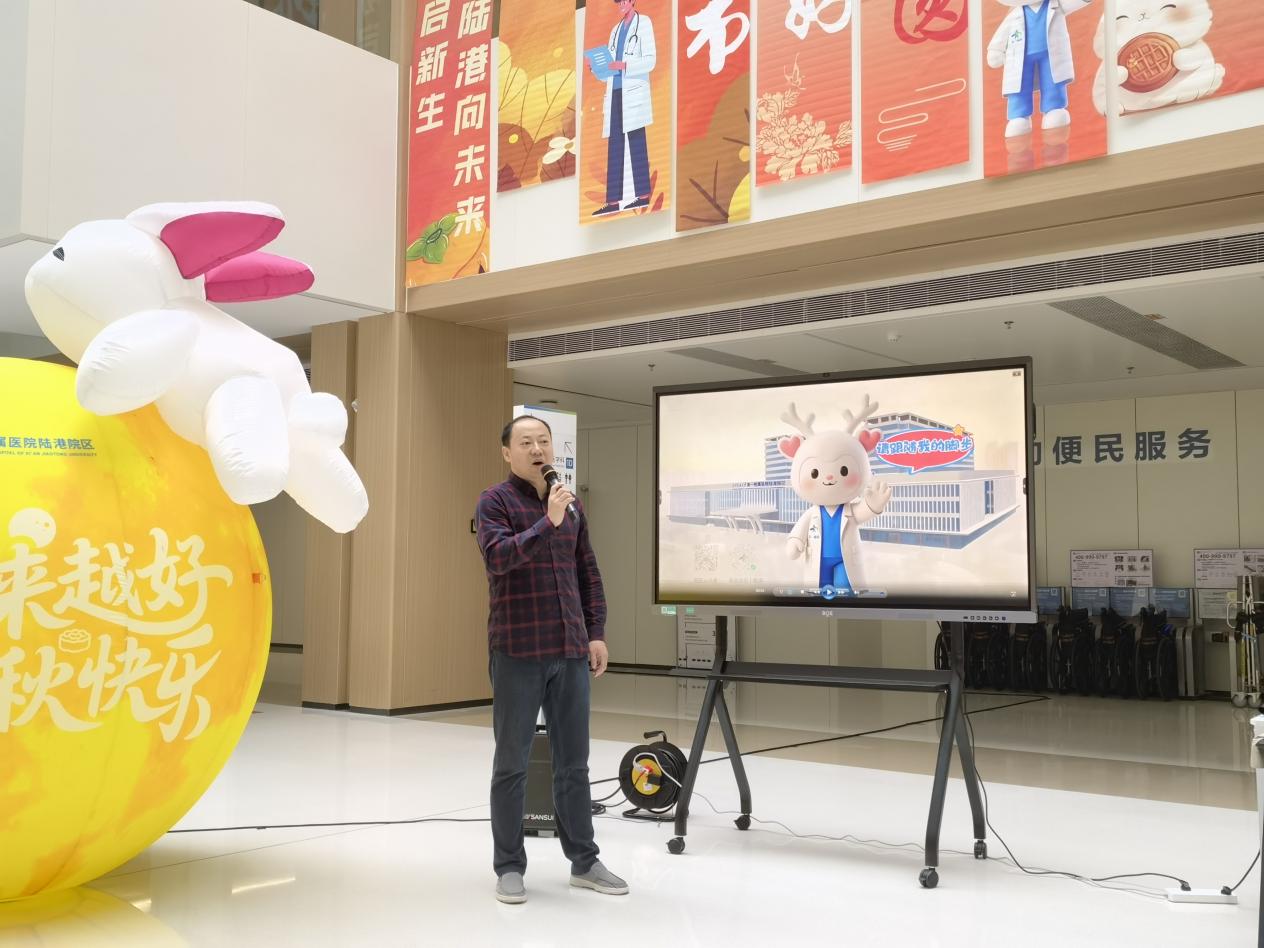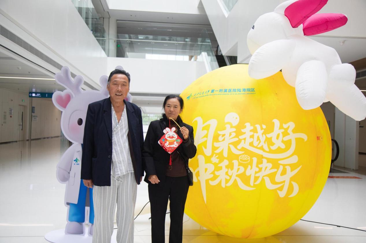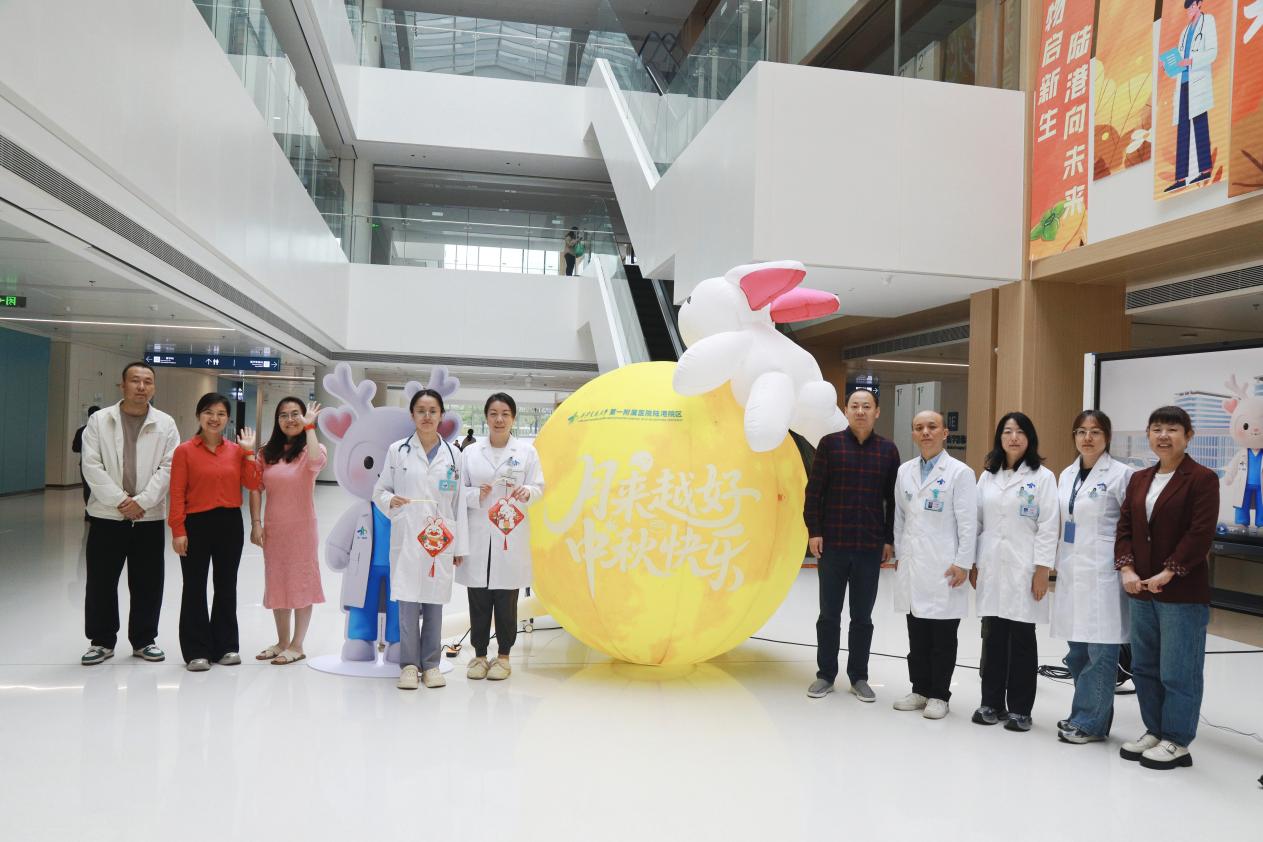 移步至创意合影打卡区,“月来越好 中秋快乐”巨型月球灯和鲜红的“我爱您祖国”心形气球矗立院区,与初次线下展出的萌趣的院区IP形象“陆一医”相映成趣,构成兼具节日庄重与童趣的视觉焦点。参与人员提着暖光黄的兔子灯和吉祥红的中国结在主题背景前定格笑脸。从指尖上的非遗传承到镜头里的团圆定格,主题互动区以沉浸式体验让双节文化可触可感,让健康服务之外的人文温度直抵人心。