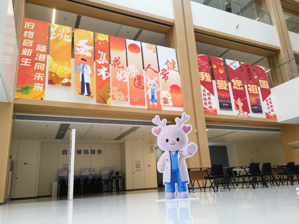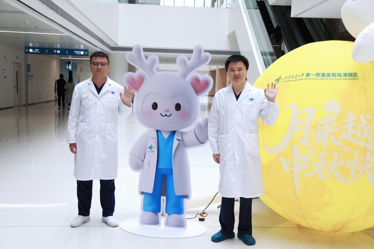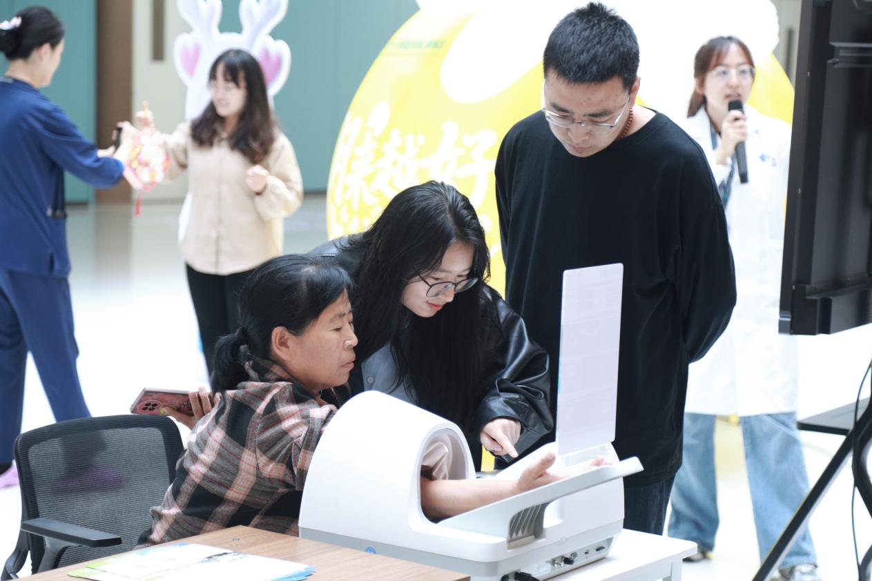 移步至创意合影打卡区,“月来越好 中秋快乐”巨型月球灯和鲜红的“我爱您祖国”心形气球矗立院区,与初次线下展出的萌趣的院区IP形象“陆一医”相映成趣,构成兼具节日庄重与童趣的视觉焦点。参与人员提着暖光黄的兔子灯和吉祥红的中国结在主题背景前定格笑脸。从指尖上的非遗传承到镜头里的团圆定格,主题互动区以沉浸式体验让双节文化可触可感,让健康服务之外的人文温度直抵人心。