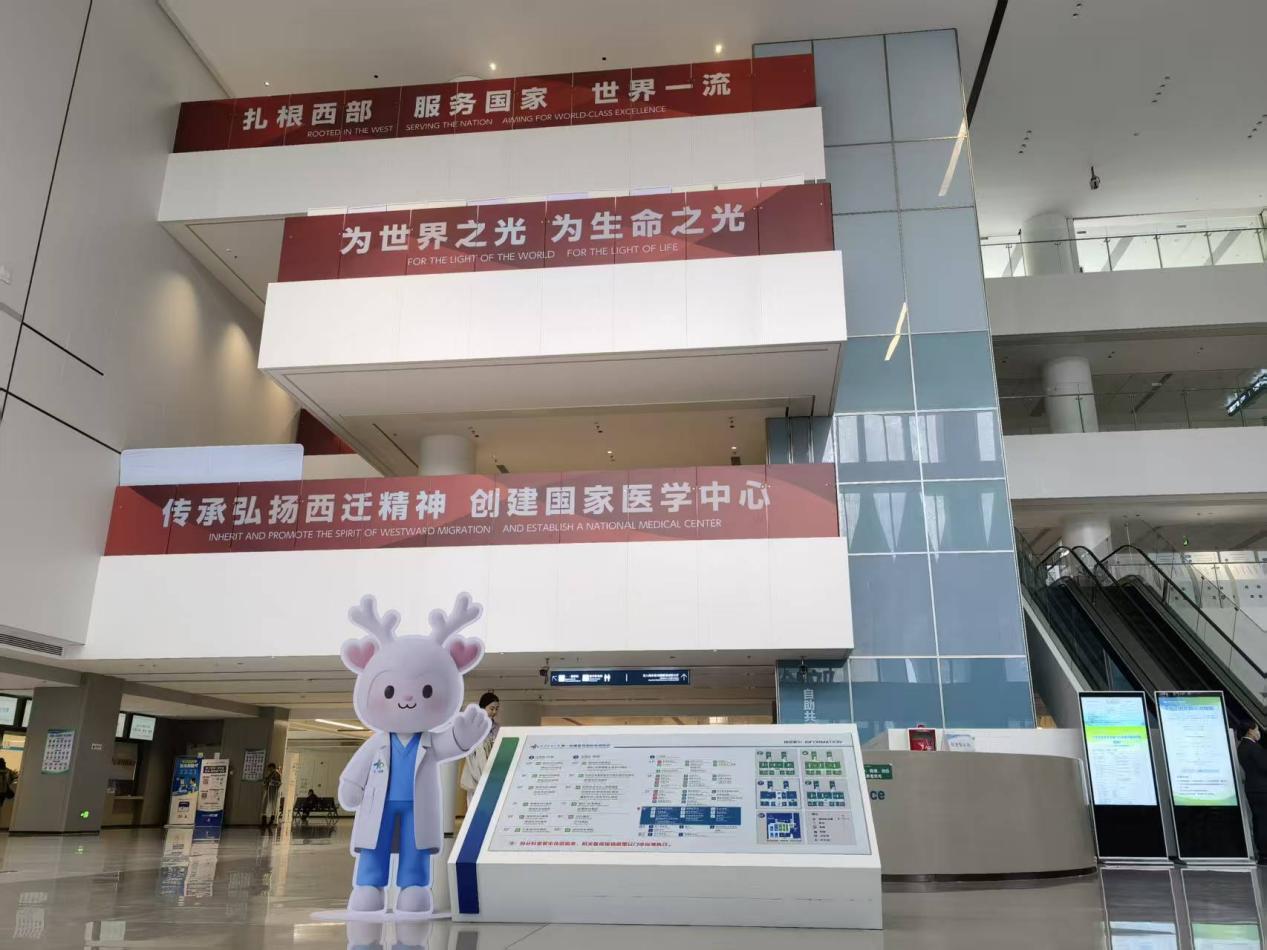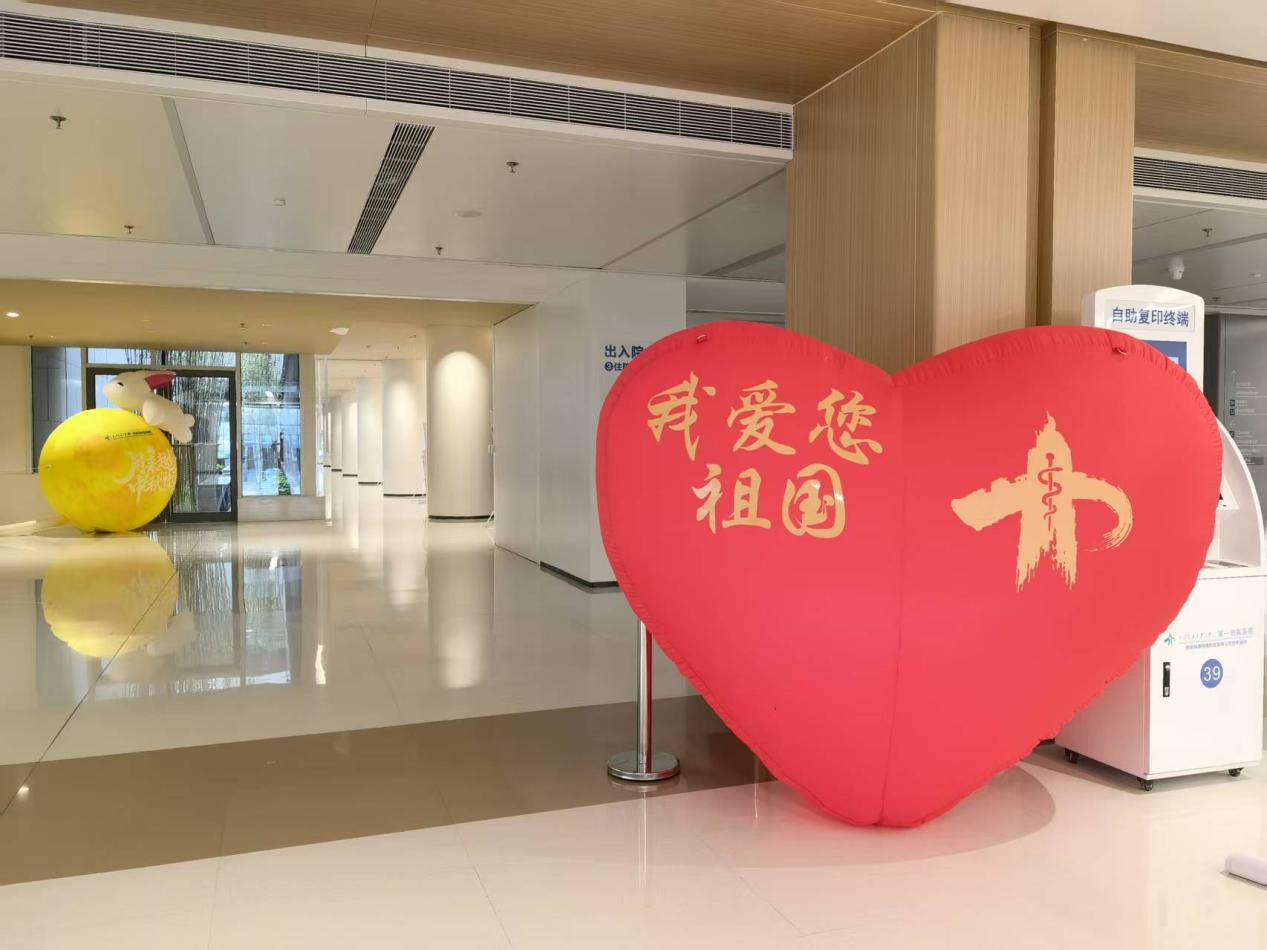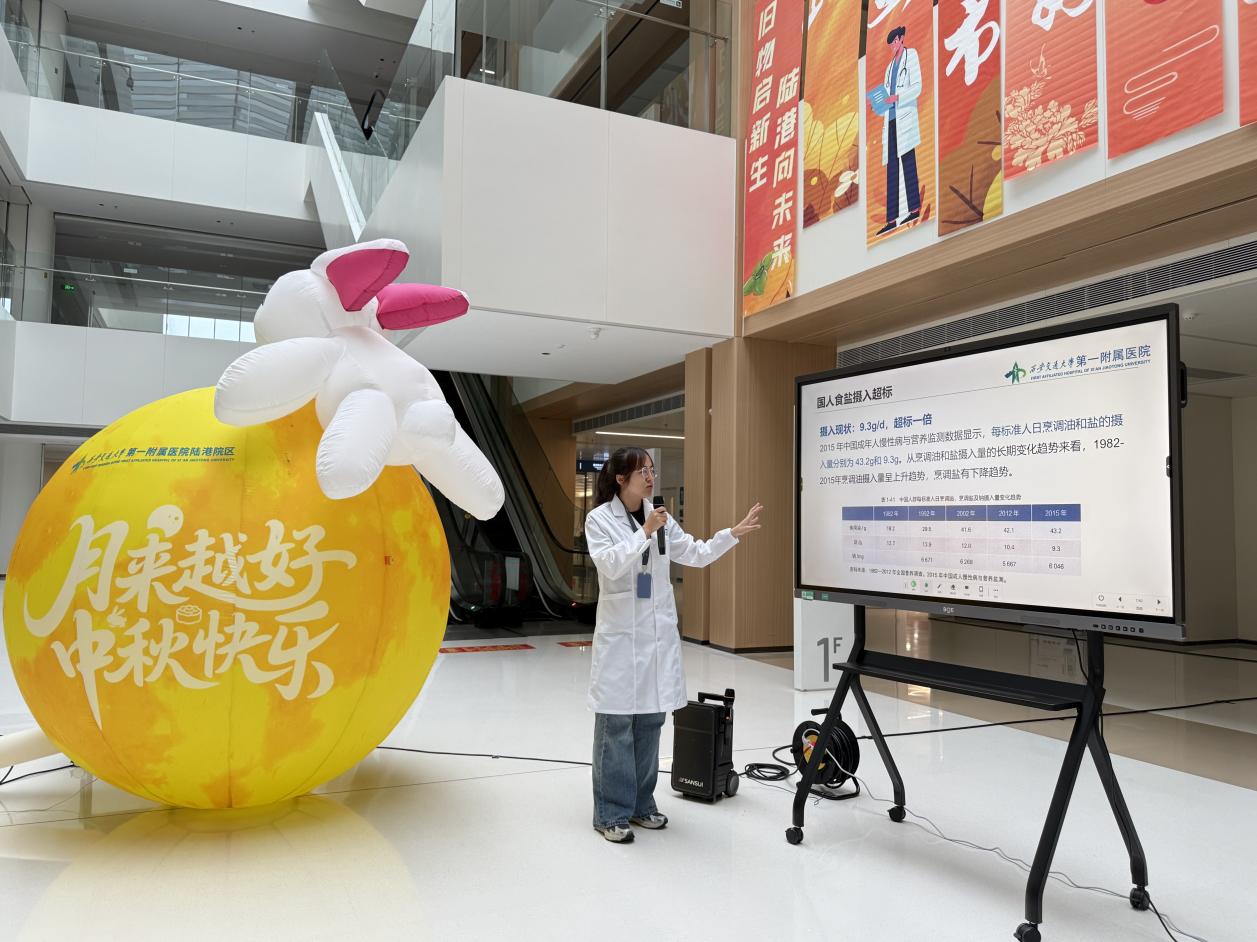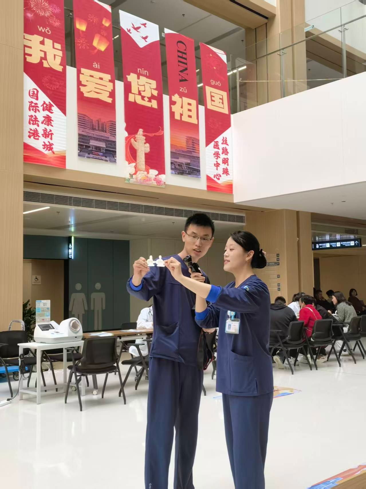 移步至创意合影打卡区,“月来越好 中秋快乐”巨型月球灯和鲜红的“我爱您祖国”心形气球矗立院区,与初次线下展出的萌趣的院区IP形象“陆一医”相映成趣,构成兼具节日庄重与童趣的视觉焦点。参与人员提着暖光黄的兔子灯和吉祥红的中国结在主题背景前定格笑脸。从指尖上的非遗传承到镜头里的团圆定格,主题互动区以沉浸式体验让双节文化可触可感,让健康服务之外的人文温度直抵人心。
