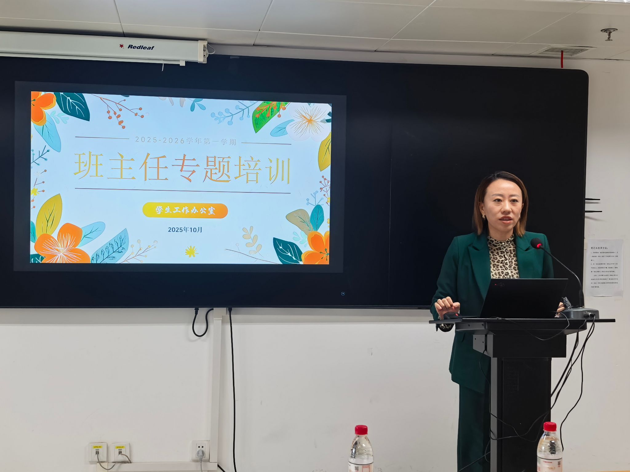 为深入贯彻落实新时代本科生教育改革发展要求,进一步夯实本科生班主任队伍建设基础,提升班主任岗位任职能力,10月14日下午,我院学生工作办公室组织开展班主任专题培训,本次培训聚焦安全稳定相关工作,特邀学校学生处副处长彭勃作授课辅导。培训由学工办主任王蜜蜜主持,学工办副主任李诚杰、全体在任本科生班主任参加培训。