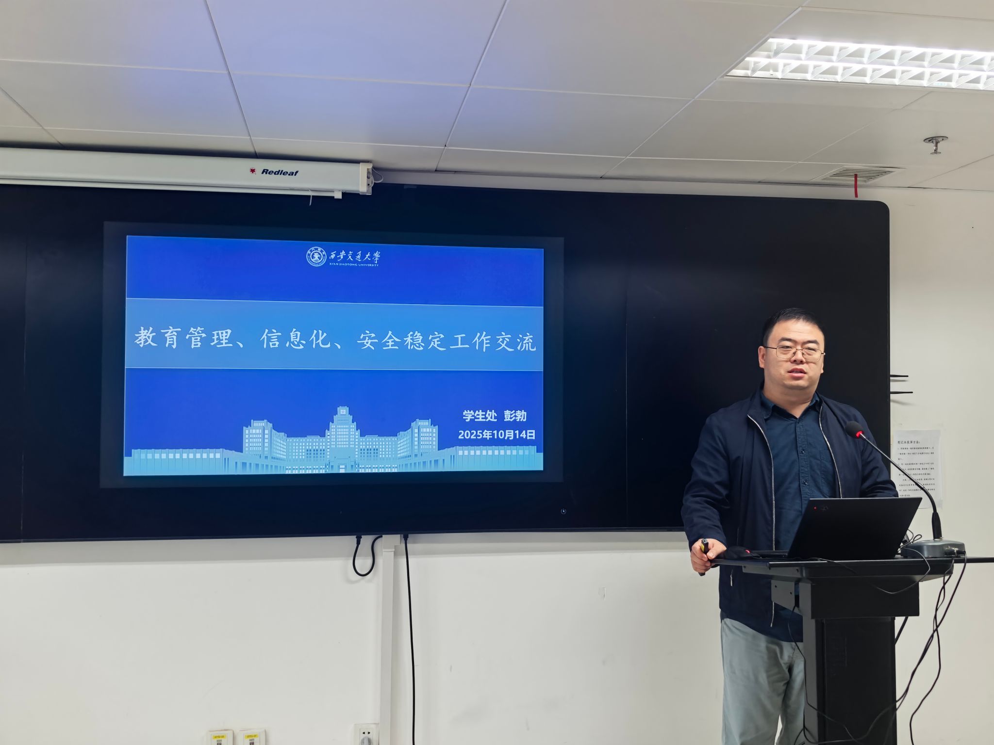 彭勃副处长从“教育管理、信息化、安全稳定”等三个方面系统介绍了学校本科生教育管理有关工作,结合当前大学生学情实际、青年群体特征、数智时代学生教育管理的机遇与挑战等方面,重点讲解了学生工作大数据分析系统、学生成长支持系统、西交学生智慧社区等平台的应用情况,就“学生成长支持系统”使用中的具体问题与班主任老师进行了互动交流。