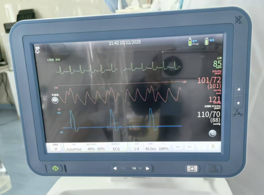 在高渊副院长的指导下,石永朋主治医师、赵奎宇住院医师相互配合迅速完成反搏球囊置入,并调整反搏心电/血压触发比例,随着反搏球囊规律反搏,血压稳定在100/70mmHg以上,孙师傅神志恢复清楚,症状缓解,心律稳定。随后,返回心血管内科CCU继续治疗。术后,孙师傅病情平稳,第二日拔出主动脉球囊反搏(IABP),目前已恢复良好顺利出院。