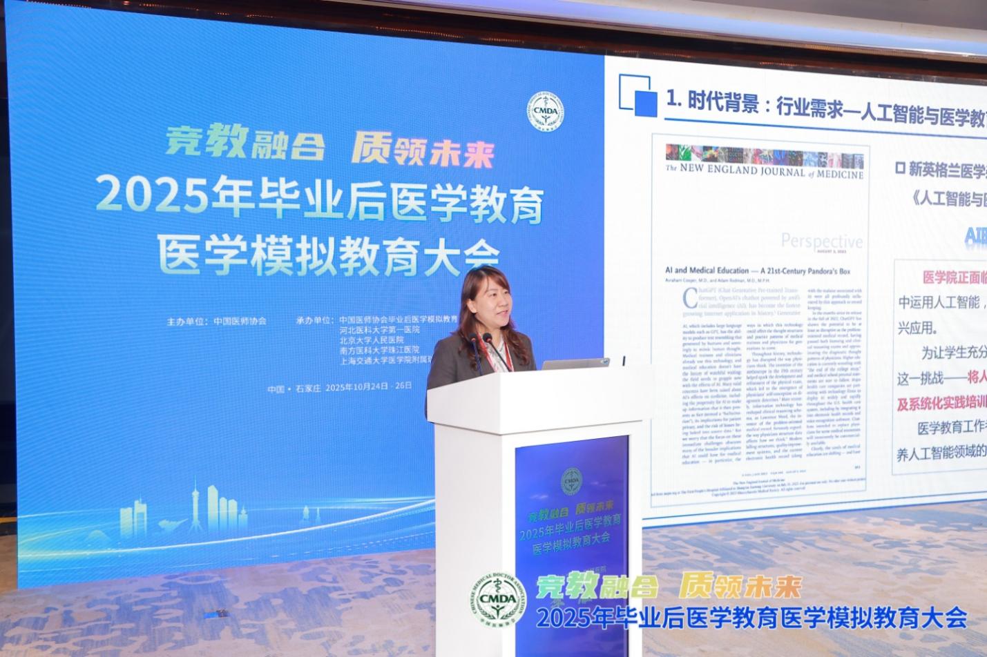 教学部李雁部长受邀在“分论坛四——人工智能与医学模拟教育”发言交流,她以“人工智能赋能医学教育,培养卓越临床医学人才”为题,从时代背景、西交实践、交医探索和未来展望四个方面,系统分享了我校及我院在人工智能赋能教育教学方面的探索实践与创新成果,与来自中南大学湘雅医院、大连医科大学附院、南华大学附院、河北医科大学附院等院校的专家们共同探讨了人工智能对医学教育的影响及数智时代医学模拟教育的革新路径,获得了现场专家的肯定。