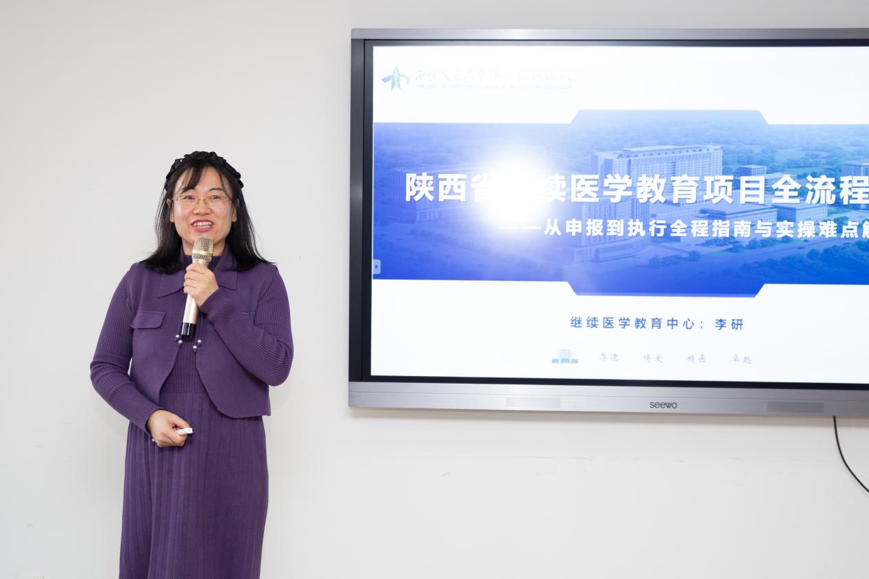 随后,我院教学部-继续医学教育中心主管李研老师作了题为《陕西省继续医学教育项目全流程详解》的专题授课。李研老师将复杂的申报流程转化为通俗易懂的实操指南,系统讲解了项目概况、申报要点、获批后执行与过程监管等全流程内容,并对历年政策指南进行了深度剖析,帮助参会人员全面掌握了继教项目申报与管理的关键环节。