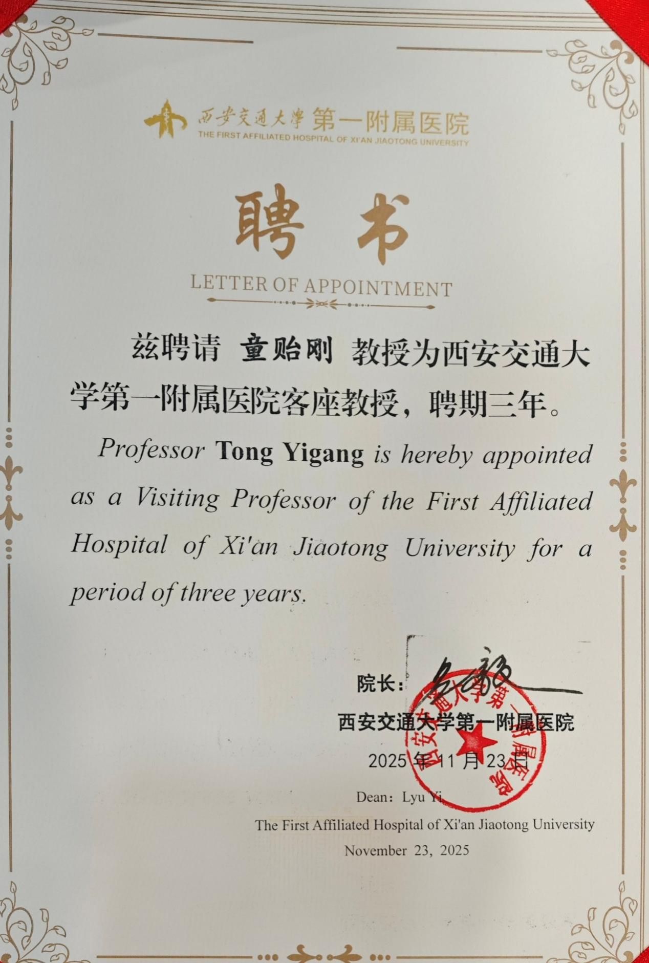 2025年11月23日,西安交通大学第一附属医院感染科客座教授聘任仪式在医院科教楼301会议室隆重举行。我国著名噬菌体学与病毒学专家、北京化工大学生命科学与技术学院院长童贻刚教授正式受聘为该院感染科客座教授。医院党委冯广林书记出席仪式并致辞,感染科何英利主任主持仪式。