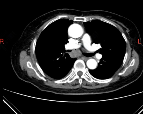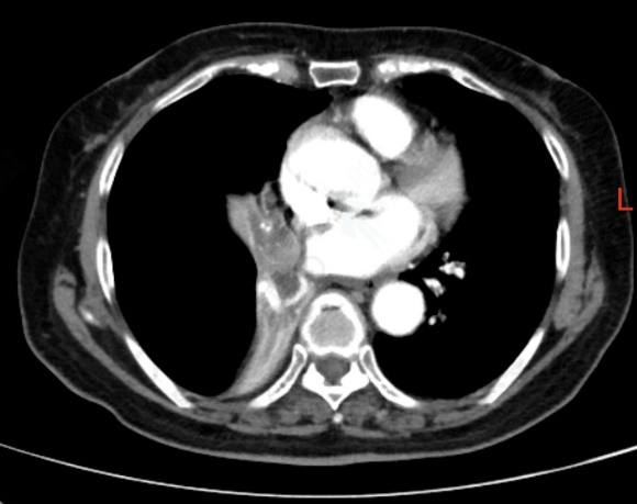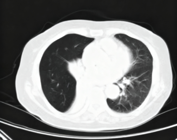 夏奶奶近两年来一直被间断的胸闷、气短、咳嗽、咳痰困扰。半月前,她的病情急剧加重,出现了痰中带血的症状,家人紧急送至东院区。呼吸与危重症医学科阎杰副主任医师接诊后,立即为夏奶奶进行胸部增强CT检查。结果提示“右肺门增大,右肺主支气管内结节状软组织密度灶,右肺下叶不张”,高度怀疑恶性肿瘤。