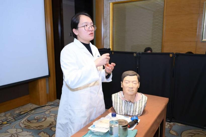 为深化学习效果,本次学习班特别设置了 “发音康复” 与 “气管切开规范护理” 两个实践工作坊,成为本次培训的亮点。“发音康复工作坊”邀请数位无喉患者,进行食管发音康复练习及分享康复历程,同伴教育促进更多患者掌握食管发音技巧,提高患者生活质量。“气管切开护理工作坊”针对喉癌患者术后气道管理的核心需求,由我科杨婷主管护师从套囊管理、气道湿化、敷料更换、并发症识别到居家护理指导,进行了全流程的标准化操作演示,极大地提升了参会者的实操能力和临床应变能力,现场护患互动与参会者反响热烈。