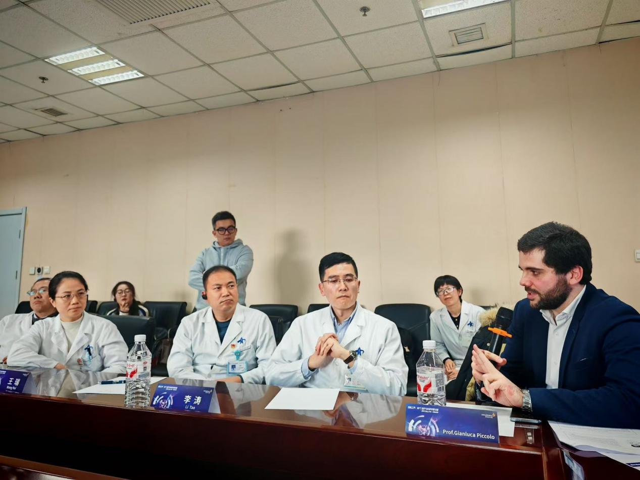 交流尾声,我院影像科杨健主任、眼科樊小娟医生、整形美容科王瑞医生分别就 NF1 临床研究设计、药物治疗眼部不良反应长期随访策略、颜面部丛状纤维瘤规范化处理等关键问题,与 Piccolo 教授展开热烈探讨,现场学术氛围浓厚,双方互享经验、互拓思路。