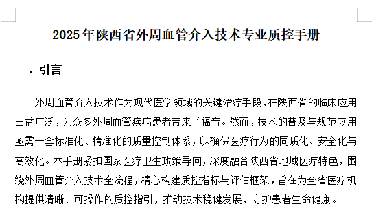 会议核心成果之一是讨论定稿《2025年陕西省外周血管介入技术专业质控手册》,该手册基于2024年国家外周血管介入技术质控中心质控指标体系,结合陕西地域医疗特色编制,涵盖胸腹主动脉腔内修复术、慢性下肢动脉闭塞症、肾动脉狭窄、颈动脉支架植入术及下肢深静脉血栓介入防治五大亚专业。