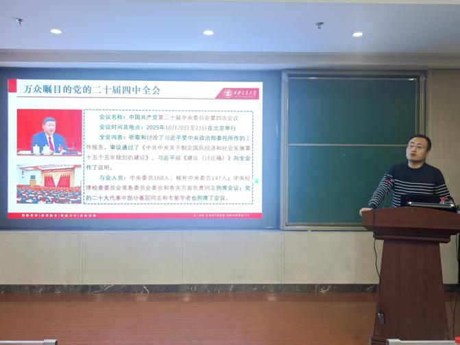 刘源副教授以《规划的力量:从“五年规划”看“中国之治”》为题,围绕党的二十届四中全会主要内容和重大意义展开解读,结合“五年规划”发展脉络,从“为什么必须坚持规划引领”“为什么必须坚持党的领导”“如何做好‘十五五’时期经济社会发展工作”三个方面进行阐释,引导同学们从宏观视野把握“中国之治”的制度优势与实践逻辑。