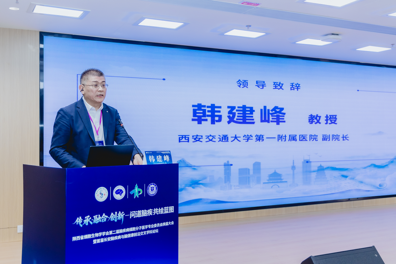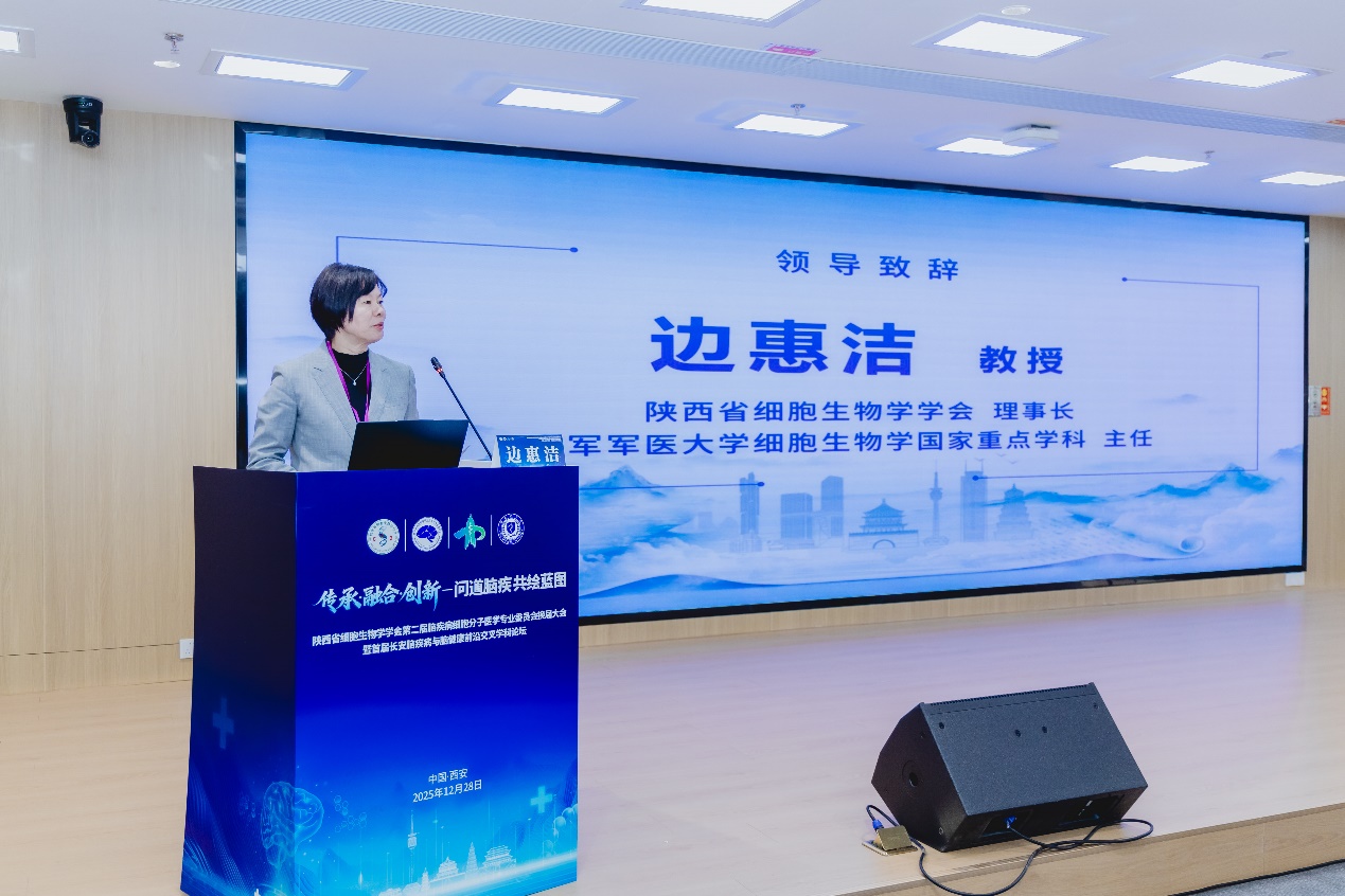 陕西省细胞生物学学会理事长边惠洁教授在致辞中,向为专委会发展倾注心血的上一届委员会全体成员致以崇高敬意,向新当选的新一届专委会班子及全体委员表示热烈祝贺。边惠洁教授指出,当前脑科学领域蓬勃发展,涵盖脑健康维护、脑疾病诊治等多个前沿方向,本次论坛汇聚顶尖学者、聚焦热点,意义深远。她强调学科融合需产学研协同与科研工作者的坚守创新,希望同仁以本次大会为契机,深耕科研、加强合作,推动脑疾病细胞分子医学领域实现新突破。