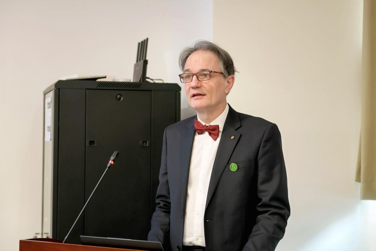 罗国刚主任主持受聘仪式。会议首先由韩建峰副院长介绍Giampietro Schiavo院士的基本情况和学术经历,并代表医院对Giampietro Schiavo院士的到来表示热烈欢迎,对其一直以来的帮助与指导表示感谢,指出神经内科在学科建设中始终坚守“开放合作、对标国际”的核心理念,积极搭建高端国际交流平台,持续拓展与全球顶尖科研机构的合作渠道。此次特邀Giampietro Schiavo院士团队到访,是提升学科核心竞争力、推动神经疾病诊疗与科研迈向国际一流水平的关键契机。韩建峰副院长代表医院为Giampietro Schiavo院士颁发客座教授聘书,屈秋民教授代表医院赠送纪念品。