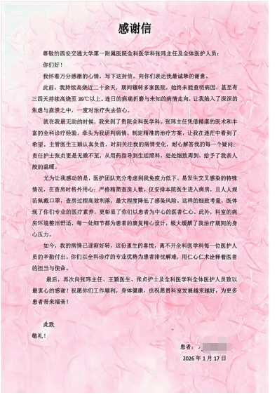如今,她的病情已逐渐好转。出院之际,她郑重写下感谢信,把一段“从无助到重拾信心”的经历交给我们。对全科医学科而言,这封信是一份认可,更是一份提醒:全科的专业,不在于只解决某一个“点”,而在于把患者当作一个完整的人,既看疾病也看背景,既抓关键也顾周全,既重技术也重陪伴与连续照护。我们愿意继续做这样的“入口”与“依靠”——在患者最迷茫的时候,把复杂的问题梳理清楚,把多学科的力量协调起来,把治疗的每一步做扎实,把患者的担忧放在心上。