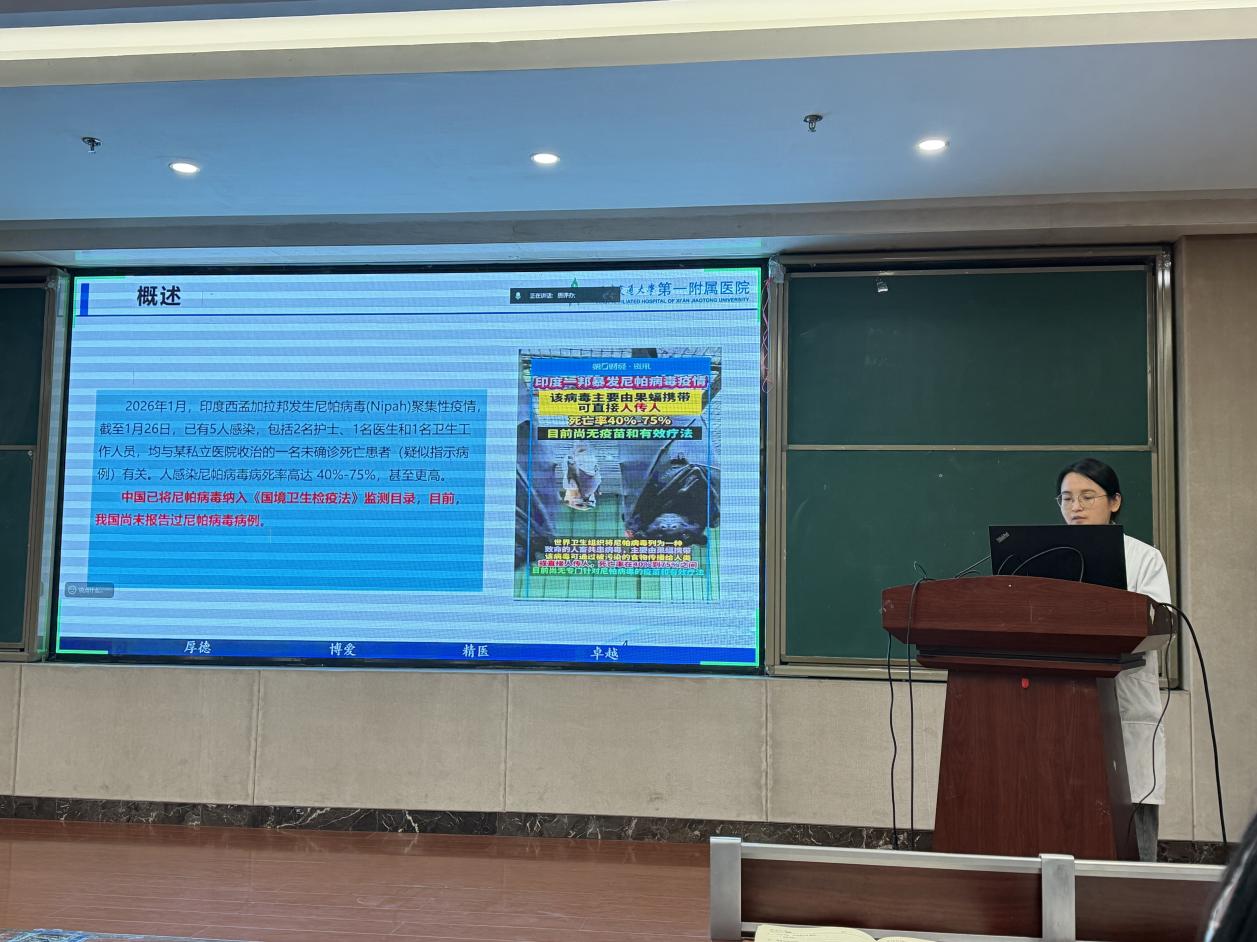 随后,围绕近期关注的重点传染病,由儿科住院总王晓晴进行了《尼帕病毒病感染预防与控制》的培训。内容涵盖疾病概述、流行病学风险、院内感染防控要点,强化了全院对新发传染病的预警与应对能力。培训环节首先由省疾控中心营食与学校卫生所史伟所长带来《食源性疾病监测要点》专题授课。史所长从实际案例切入,系统阐述了食源性疾病的定义、监测报告流程、暴发识别方法,并重点讲解了医疗机构在病例发现、上报及协同防控中的关键职责,进一步夯实了医务人员在相关领域的专业基础。