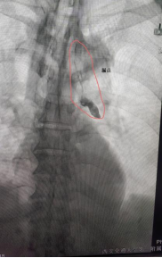 经介入手术室梅娜护士长,白婷副护士长协调下,我科汤瑞祥主治医师率先成功开展胸导管栓塞术。超声引导下细针穿刺双侧腹股沟淋巴结成功后,缓慢经淋巴结注入造影剂。造影剂下显露胸导管走行及漏点位置。DSA下经腹穿刺腹部淋巴管成功后置入导丝及微导管。于微导管内注入生物胶。注入完成后造影显示胸导管破损处栓塞确切。术后在科室护理人员精心护理下,患者介入后第2天引流液即转为正常并顺利拔除胸腔引流管。患者体表创伤仅为细针穿刺损伤。