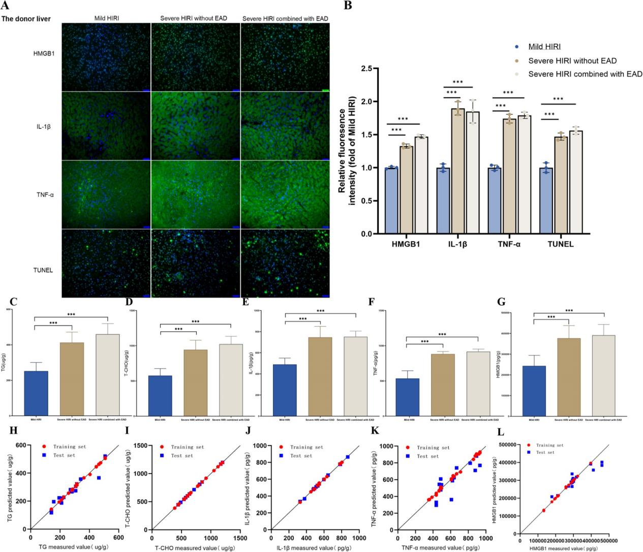 该研究实现了肝组织脂质与炎症因子的无创光谱量化。近红外光谱能敏感捕捉组织中水、脂等分子的特征吸收峰。团队通过高光谱成像,在900–1700 nm波段内精准识别出肝组织中脂肪(甘油三酯及胆固醇)含量与水含量的变化,并首次实现对IL-1β、TNF-α、HMGB1等关键炎症因子的无创预测,模型预测精度(R⟡ > 0.9)显著优于传统方法。