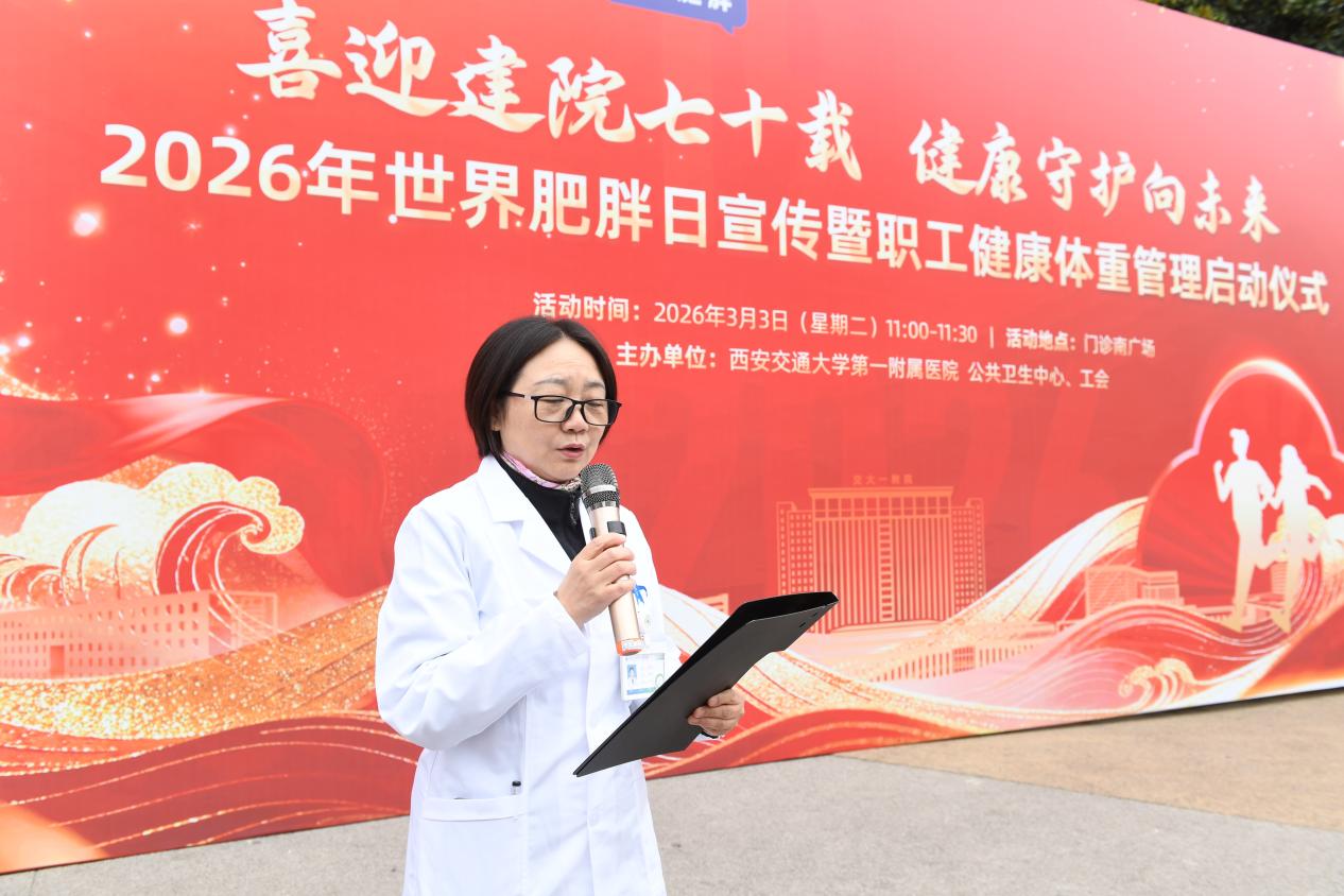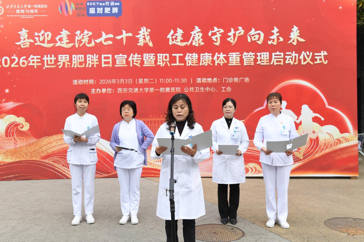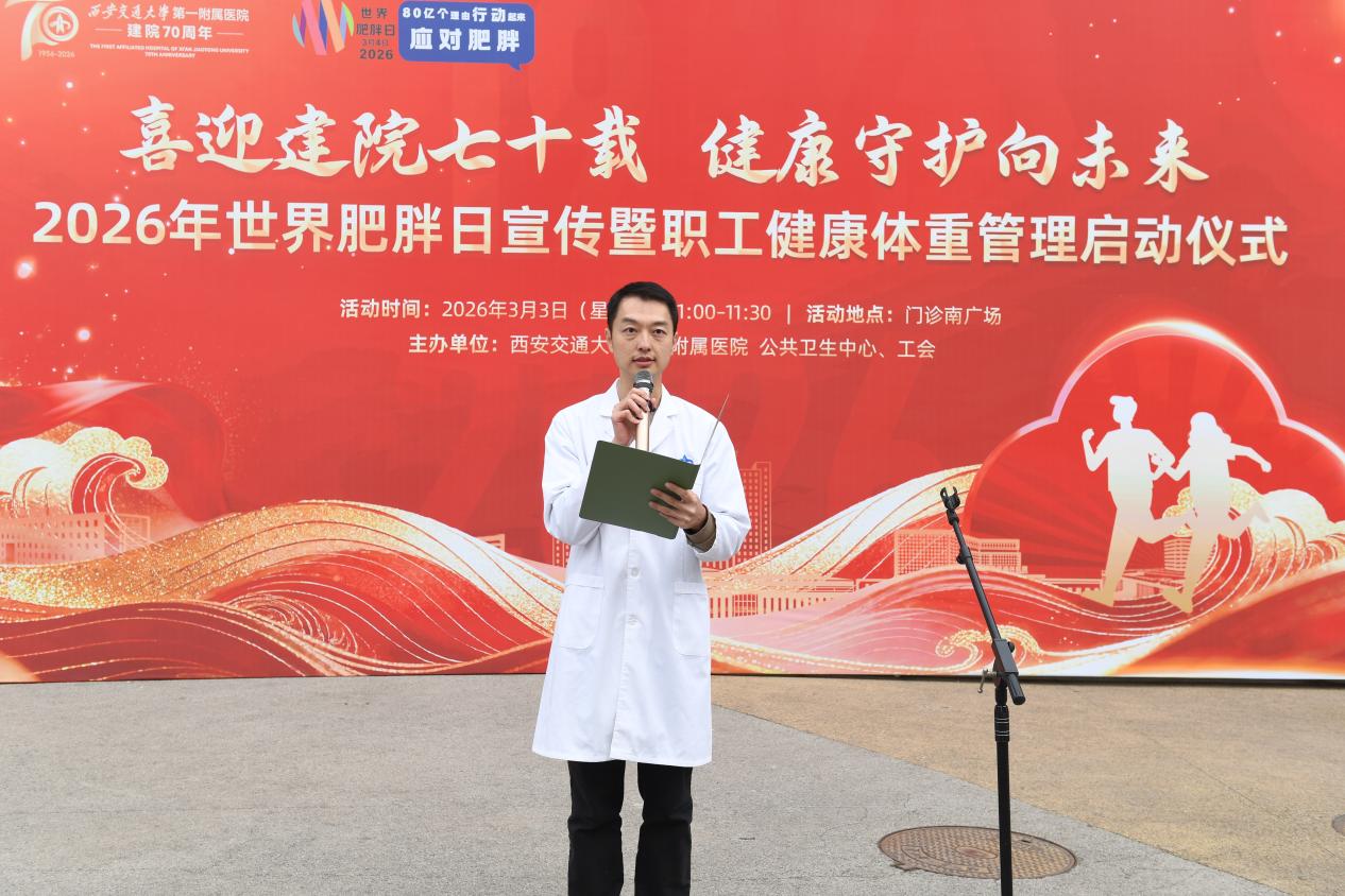 春启新程,健康同行。值此西安交通大学第一附属医院建院70周年重要历史节点,为积极响应2026年世界肥胖日“80 亿个理由行动起来应对肥胖” 全球倡议,大力倡导 “体重管理,医者先行” 理念,3月3日上午,医院在门诊南广场隆重举行建院70周年——2026年世界肥胖日暨职工健康体重管理启动仪式。院领导、各科室健康管理员、工会委员代表、职工文体协会代表、离退休代表及在职职工代表齐聚现场,共同开启全院职工健康体重管理新征程。本次活动由医院公共卫生中心、工会联合主办,公共卫生中心主任陈天艳主持。