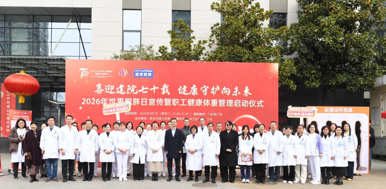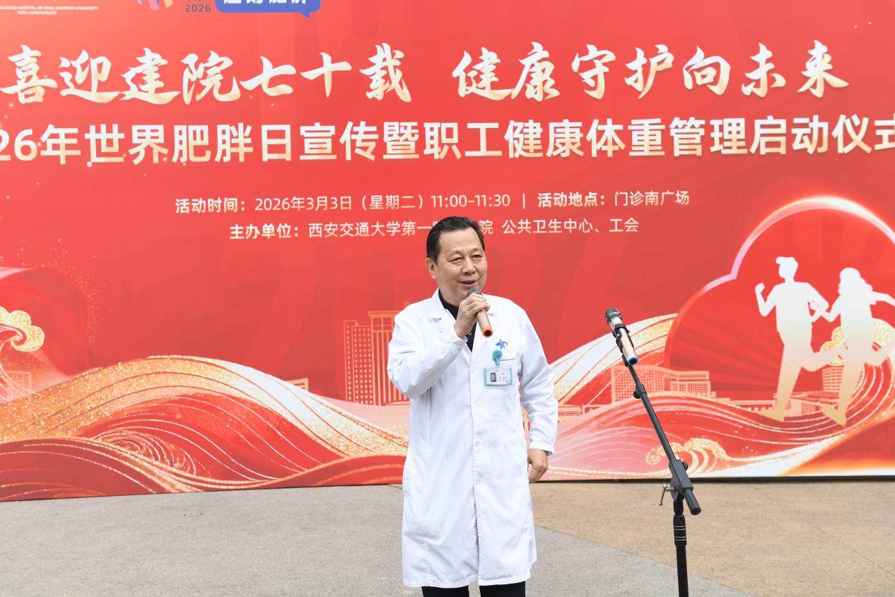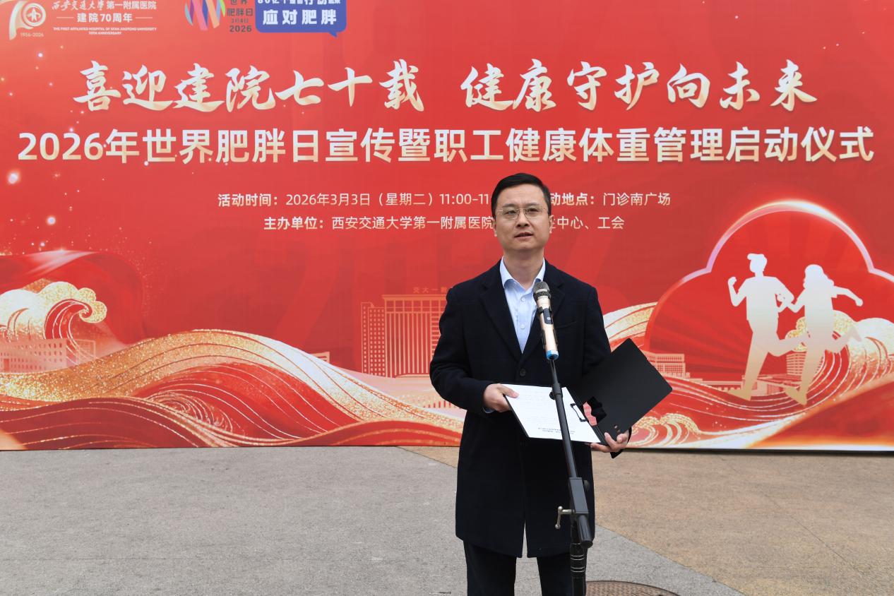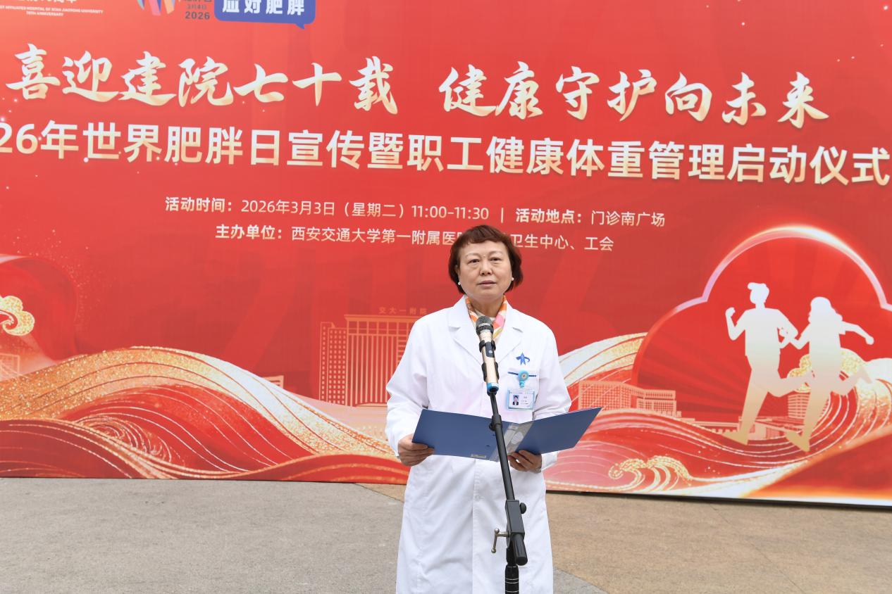 春启新程,健康同行。值此西安交通大学第一附属医院建院70周年重要历史节点,为积极响应2026年世界肥胖日“80 亿个理由行动起来应对肥胖” 全球倡议,大力倡导 “体重管理,医者先行” 理念,3月3日上午,医院在门诊南广场隆重举行建院70周年——2026年世界肥胖日暨职工健康体重管理启动仪式。院领导、各科室健康管理员、工会委员代表、职工文体协会代表、离退休代表及在职职工代表齐聚现场,共同开启全院职工健康体重管理新征程。本次活动由医院公共卫生中心、工会联合主办,公共卫生中心主任陈天艳主持。