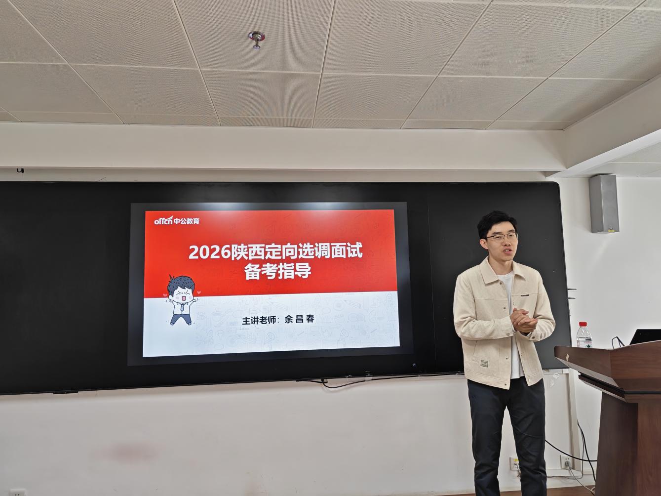 余昌春老师以“2026年陕西定向选调面试备考指导”为题进行授课。他从陕西省选调结构化面试考情入手,系统讲解了综合分析、应急处突、计划组织协调、人际交往等四类重点面试题型,并结合典型例题对各类题型的作答要素逐一分析,总结了各题型的思考路径、作答要点及高分建议,为同学们全面讲解了选调面试的答题技巧。