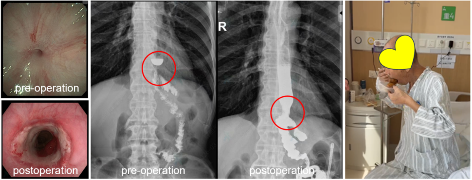 3月12日早上刚到病房,严小鹏医生就匆匆递给我几张胃镜和食管造影的报告单,同时,我看到旁边凳子上坐着一名极度瘦弱的老人,我意识到这又是一个奔着磁外科技术而来的复杂病患。贲门胃底恶性肿瘤术后食管空肠吻合口重度狭窄,外院内镜下球囊扩张无效,患者近3个月未进食、进水,并且随手都带着一个纸杯子,重度的食管狭窄让他连唾液也无法下咽。这个病患的治疗将极其复杂,并且风险很高,一时间我竟然不知如何着手。我缓缓抬头看向严小鹏医生眉头微蹙的脸,一双坚定而深邃的眼神让我意识到这名患者应该是有希望的。