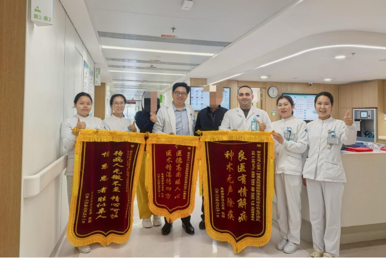 今天患者精神焕发,与入院时病殃殃的样子判若两人,和善的患者和家属在离院前给我们赠送来了锦旗(科室护士悄悄告诉我:在中国,这是患者对帮助他们的医护人员表达敬意和感激之情的最高形式)。我很诧异在锦旗上竟然有我的名字,我想我是不是已经是磁外科团队的一员了。非常有幸,我参与了这名患者治疗的全过程,亲身见证了磁外科的神奇和中国医生的优秀,回国后我会把西安交通大学第一附属医院磁外科团队的故事讲给我的同事,希望我们国家也能开展这样的磁外科手术。
