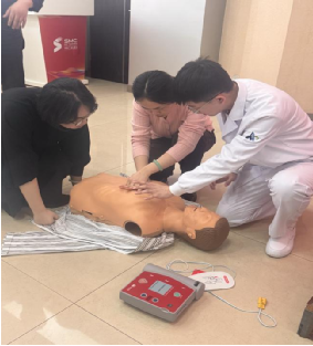 刘昱副主任带领科室宋旭、周碧煜现场开展急救技能培训,重点讲解并示范心肺复苏操作。在场职工踊跃参与、实战练习、积极互动,在专家手把手指导下掌握关键急救技能,学习氛围浓厚。