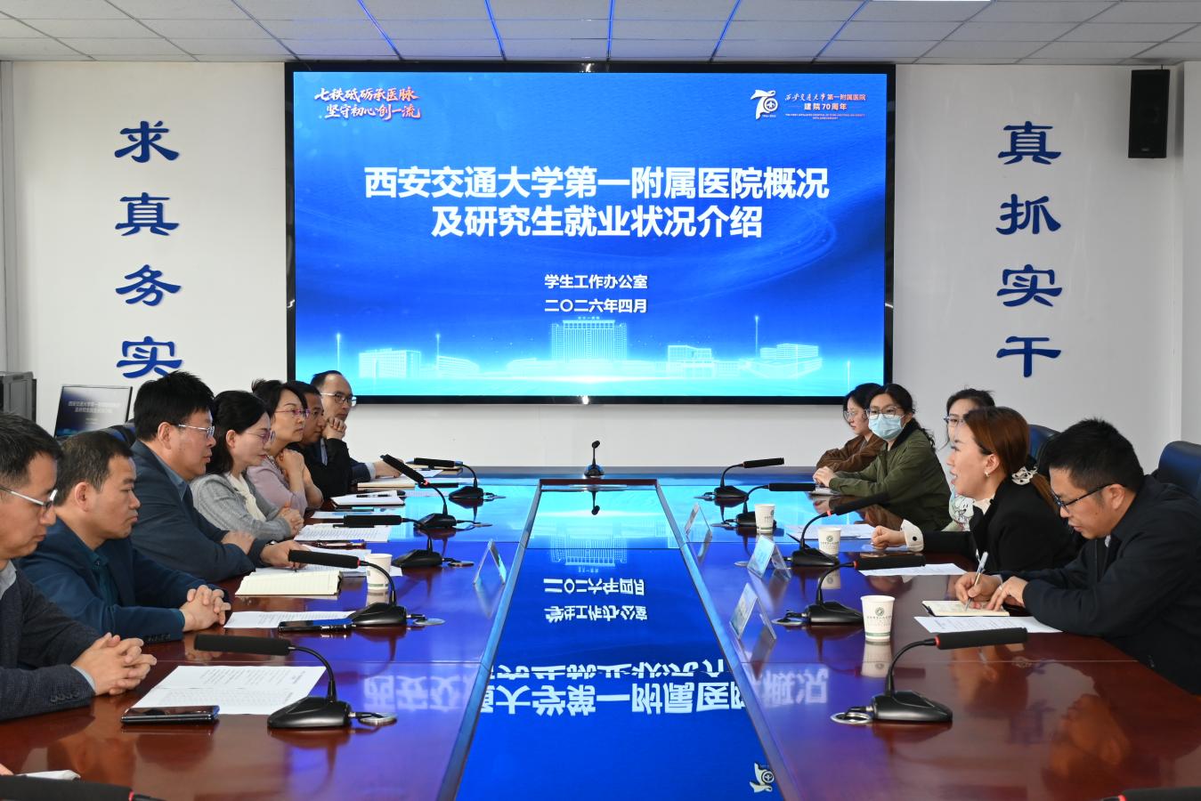 在咸阳市第一人民医院,总会计师王康令、人事科科长李畋静、有关临床科室主任、校友代表等参加交流。王康令对交大一附院师生代表一行来院交流表示欢迎,希望持续深化人才互动,畅通输送渠道,建立长期人才交流机制。李畋静梳理了医院八十余年发展脉络,介绍了眼科亚专业化、十大专科中心建设成果、人才招聘政策及岗位需求情况。肝胆胰外科主任贾蓬勃、眼科副主任医师郑雪丽作为校友代表,结合自身经历分享了择业心得,鼓励学弟学妹在医学舞台施展才干。