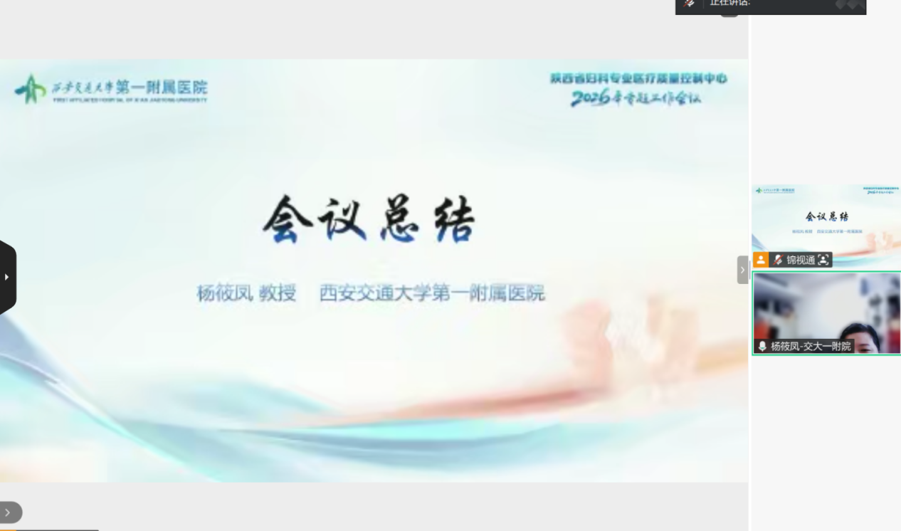 会议最后,陕西省妇科质控中心主任委员杨筱凤作总结讲话。她对讲者的精彩分享及会议主持人的辛勤工作表示衷心感谢,指出规范化诊疗是保障患者安全的基石,全省妇科医务工作者要牢牢把握诊断合理性、治疗规范性、全链条随访三大核心,以高标准、严要求落实各项质控举措,不断提升妇科诊疗同质化、精细化水平,以高质量医疗服务切实守护三秦大地女性健康。