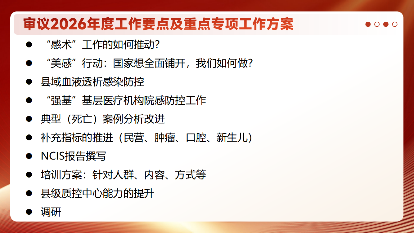 随后,全体专家委员进入审议环节,共同围绕2026年度工作要点及重点专项工作方案展开深入研讨。审议议题覆盖“感术”行动推动落实、“美感”行动省级承接方案、县域血液透析感染防控落地路径、“强基”基层医疗机构院感防控工作推进、典型院感案例分析改进机制建设、民营与口腔等重点领域补充指标推进、NCIS报告撰写分工、年度培训方案优化、县级质控中心能力提升举措以及年度调研主题确定等十余项重点内容。与会委员结合各自专业领域与工作实际,踊跃发言、深入交流,既有对宏观政策的精准把握,也有对基层实践的真切体察,提出了诸多具有建设性的意见建议,为中心进一步完善年度工作方案提供了重要参考。