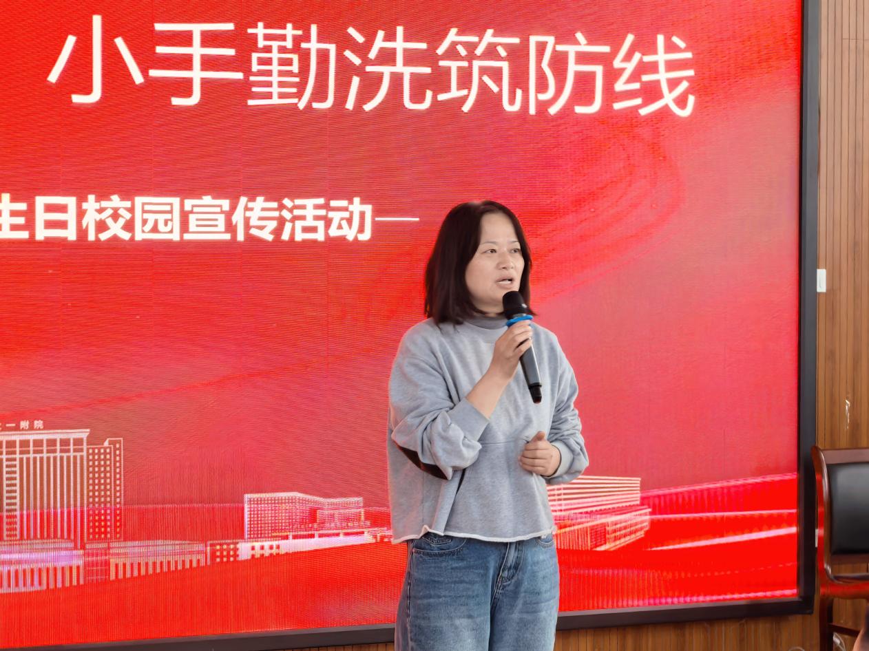 随后,交大一附院总院医务部感控办李倩副主任发言。她指出,手卫生是预防疾病传播最为经济且有效的手段,尤其在校园这样的人员密集场所,培养学生良好的手卫生习惯,对构建健康校园具有重要意义。她结合当前常见传染病的防控形势,深入浅出地阐述了正确洗手的重要性,并表示医院将持续发挥专业优势,以党建为引领,将更多实用的健康知识送进校园,切实守护师生健康。