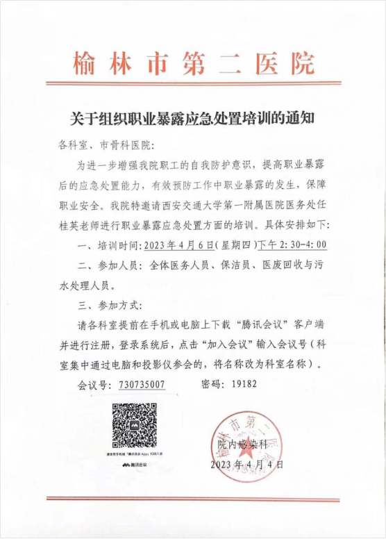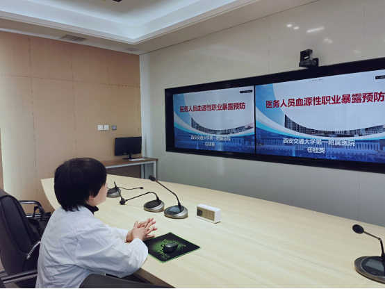 2023年4月6日下午,任桂英老师受邀与榆林二院院感科联合在两地为榆林二院全体医务人员、保洁员、医废回收与污水处理人员进行职业暴露预防线上培训。