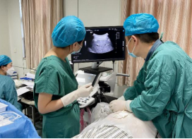2023年4月6日下午17:30分,超声医学科魏炜教授凭借高超的技术与丰富的穿刺经验,在超声引导下对患者实施了精准肝静脉穿刺(图2),整个穿刺过程快速、顺利、安全。